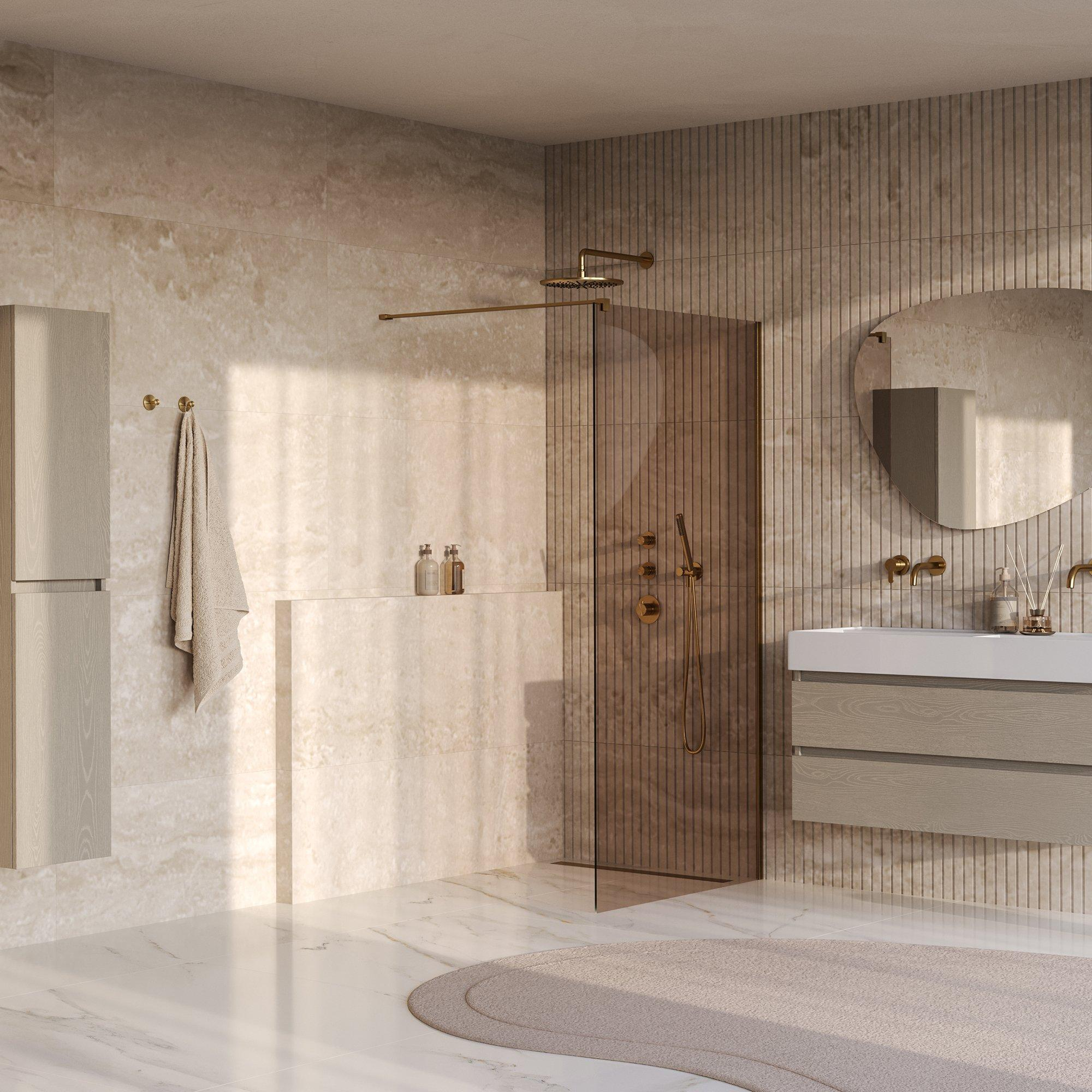 Deze inloopdouche is een echte blikvanger dankzij het bronzen glas met een geborstelde goudkleurige PVD-coating. Dit geeft niet alleen een warme, luxe uitstraling, maar zorgt er ook voor dat je badkamer een unieke en moderne sfeer krijgt. Het vlakke glas en de subtiele kleurtonen passen perfect in diverse interieurstijlen, van klassiek tot eigentijds. Zo creëer je een badkamer die niet alleen functioneel is, maar ook een echte eyecatcher vormt. Met deze stijlvolle douchewand voeg je direct karakter en elegantie toe aan jouw badkamer.