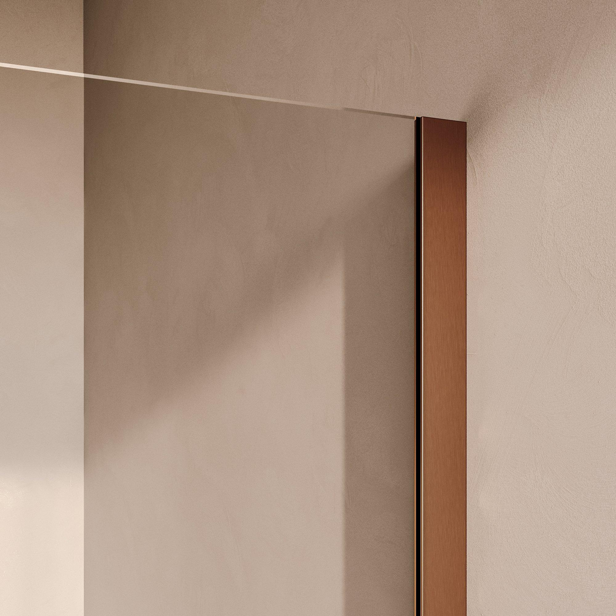 De combinatie van helder glas met een geborstelde koper PVD-coating geeft deze douchewand een unieke en eigentijdse uitstraling. Het koperkleurige beslag voegt een warme, luxe touch toe die perfect past bij moderne en klassieke badkamers. Door het strakke, vlakke glas en de minimalistische vormgeving ontstaat een tijdloos design dat moeiteloos aansluit bij diverse interieurstijlen. Zo geniet je niet alleen van een functionele douche, maar ook van een echte blikvanger die jouw badkamer naar een hoger niveau tilt.