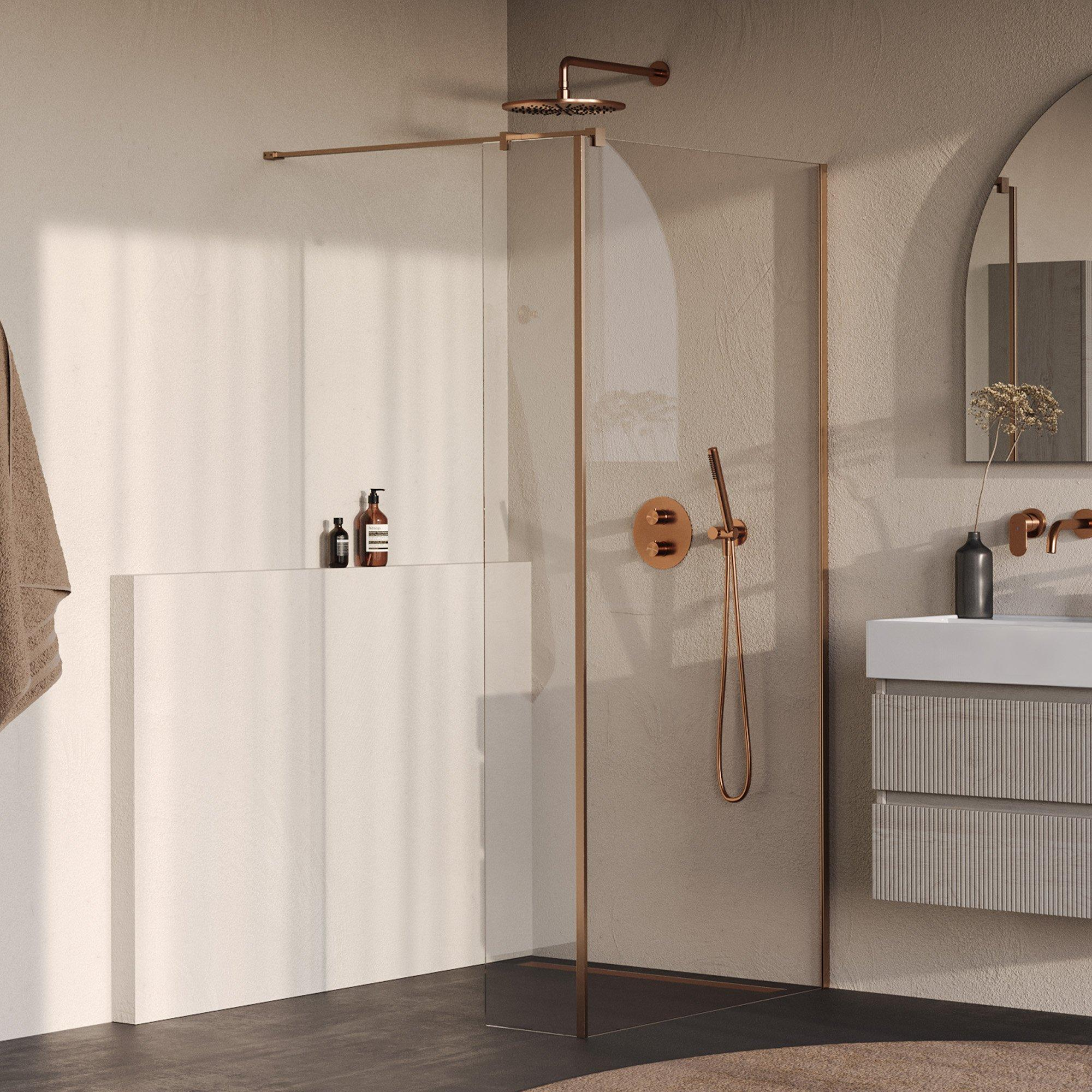 Deze inloopdouche is een toonbeeld van tijdloze elegantie. Het heldere glas zorgt voor een frisse, open uitstraling die jouw badkamer optisch vergroot. De geborsteld koper PVD-coating geeft een warme, exclusieve touch die perfect aansluit bij moderne en klassieke interieurs. Door de combinatie van glas en koper ontstaat een unieke sfeer die direct opvalt. Zo voeg je niet alleen een functioneel element toe, maar ook een stijlvol statement dat jouw badkamer onderscheidt van de rest.