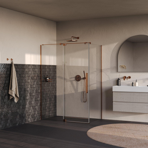 De combinatie van helder glas met een geborstelde koperkleurige PVD-afwerking zorgt voor een tijdloze en verfijnde uitstraling. Deze douchecabine is een echte blikvanger die moeiteloos past in zowel moderne als klassieke badkamers. Het subtiele koperdetail voegt warmte toe zonder te overheersen, waardoor je badkamer een unieke en persoonlijke touch krijgt. Door het heldere glas blijft de ruimte licht en open ogen, wat bijdraagt aan een gevoel van rust en ruimte. Zo geniet je niet alleen van functionaliteit, maar ook van een stijlvol design dat je badkamer compleet maakt.