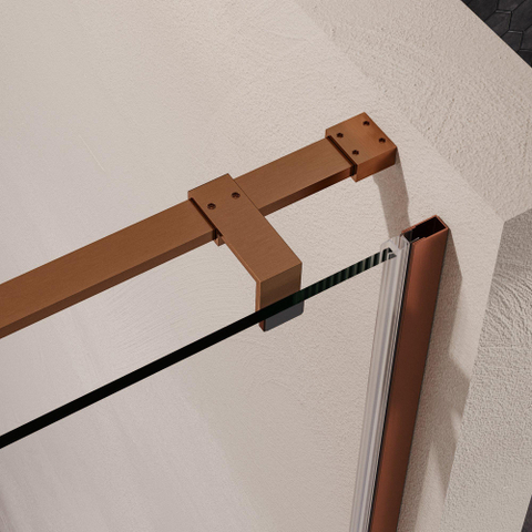 Deze nisdeur straalt pure elegantie uit door het heldere glas in combinatie met de geborstelde koperkleurige PVD-coating. De warme tint van het koper geeft een unieke en exclusieve sfeer aan je badkamer, die je niet snel ergens anders vindt. Door het minimalistische design en de hoogwaardige afwerking past deze deur moeiteloos bij diverse interieurstijlen, van modern tot klassiek. Zo creëer je een badkamer die niet alleen praktisch is, maar ook een lust voor het oog.