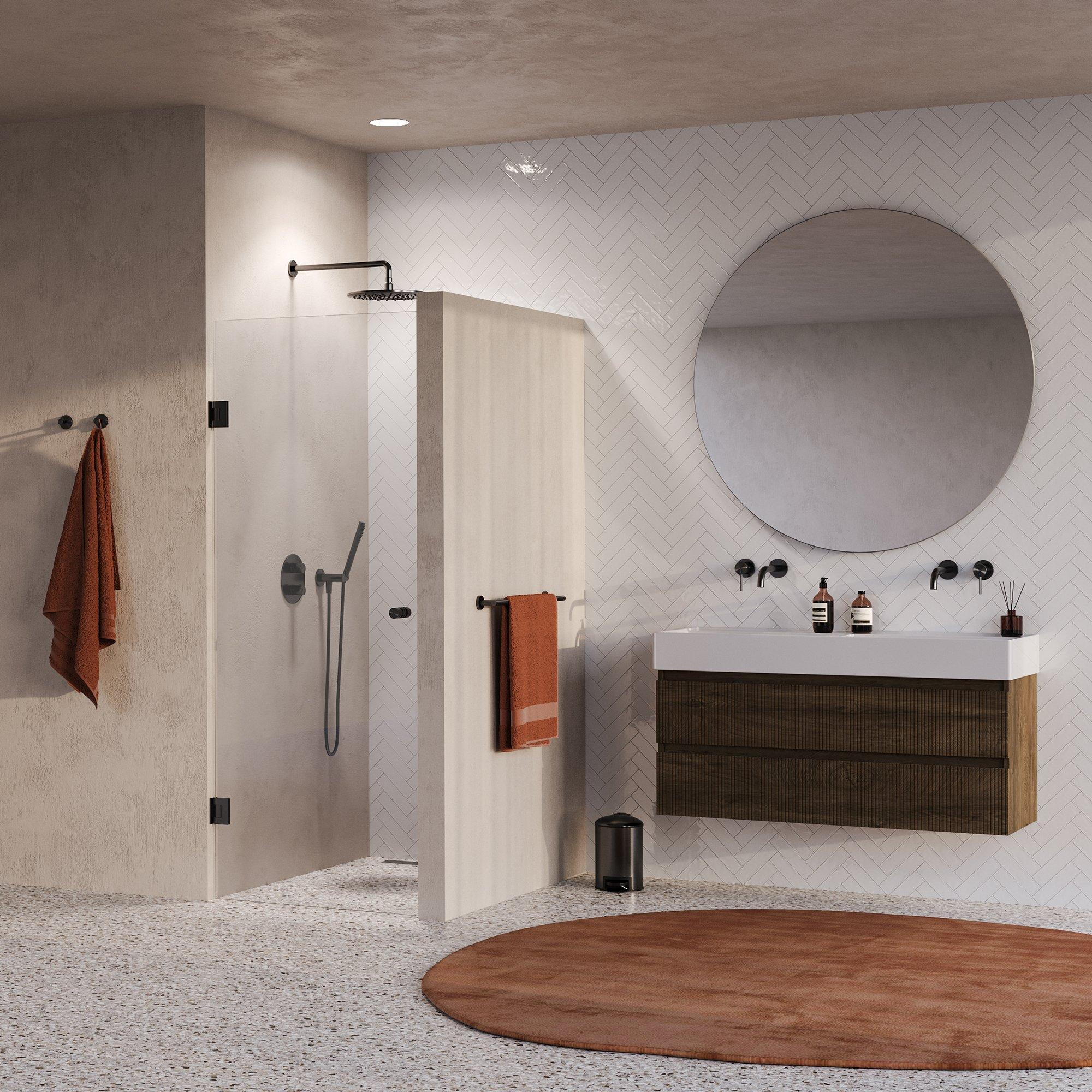 Deze nisdeur is een toonbeeld van moderne elegantie. De geborstelde gunmetal PVD-afwerking geeft een verfijnde, antracietkleurige look die je badkamer een eigentijdse en luxe sfeer geeft. Het heldere glas zorgt voor een open en lichte uitstraling, waardoor je badkamer ruimer lijkt. Met deze deur kies je voor een design dat zowel tijdloos als trendy is, passend bij uiteenlopende interieurstijlen. Zo geniet je niet alleen van functionaliteit, maar ook van een visueel hoogstandje dat jouw badkamer echt afmaakt.