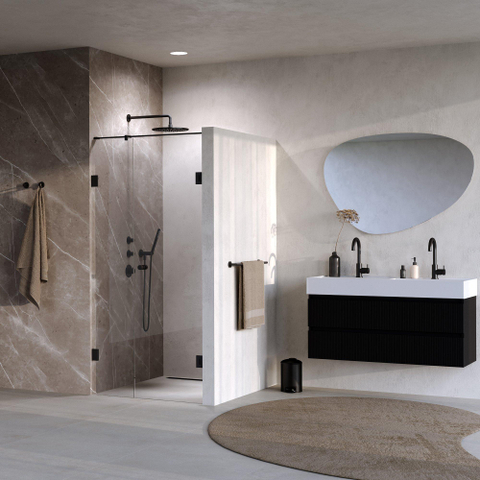 Gemaakt van robuust glas en hoogwaardig roestvrij staal, is deze nisdeur ontworpen om jarenlang mee te gaan. De glascoating beschermt tegen kalkaanslag en vuil, waardoor het glas langer helder blijft en het schoonmaken een stuk eenvoudiger wordt. De matzwarte afwerking is bestand tegen krassen en corrosie, wat zorgt voor een blijvend mooie uitstraling. Dankzij deze duurzame eigenschappen investeer je in een product dat niet alleen mooi is, maar ook betrouwbaar en onderhoudsvriendelijk. Zo geniet je langdurig van een perfecte doucheomgeving zonder zorgen.