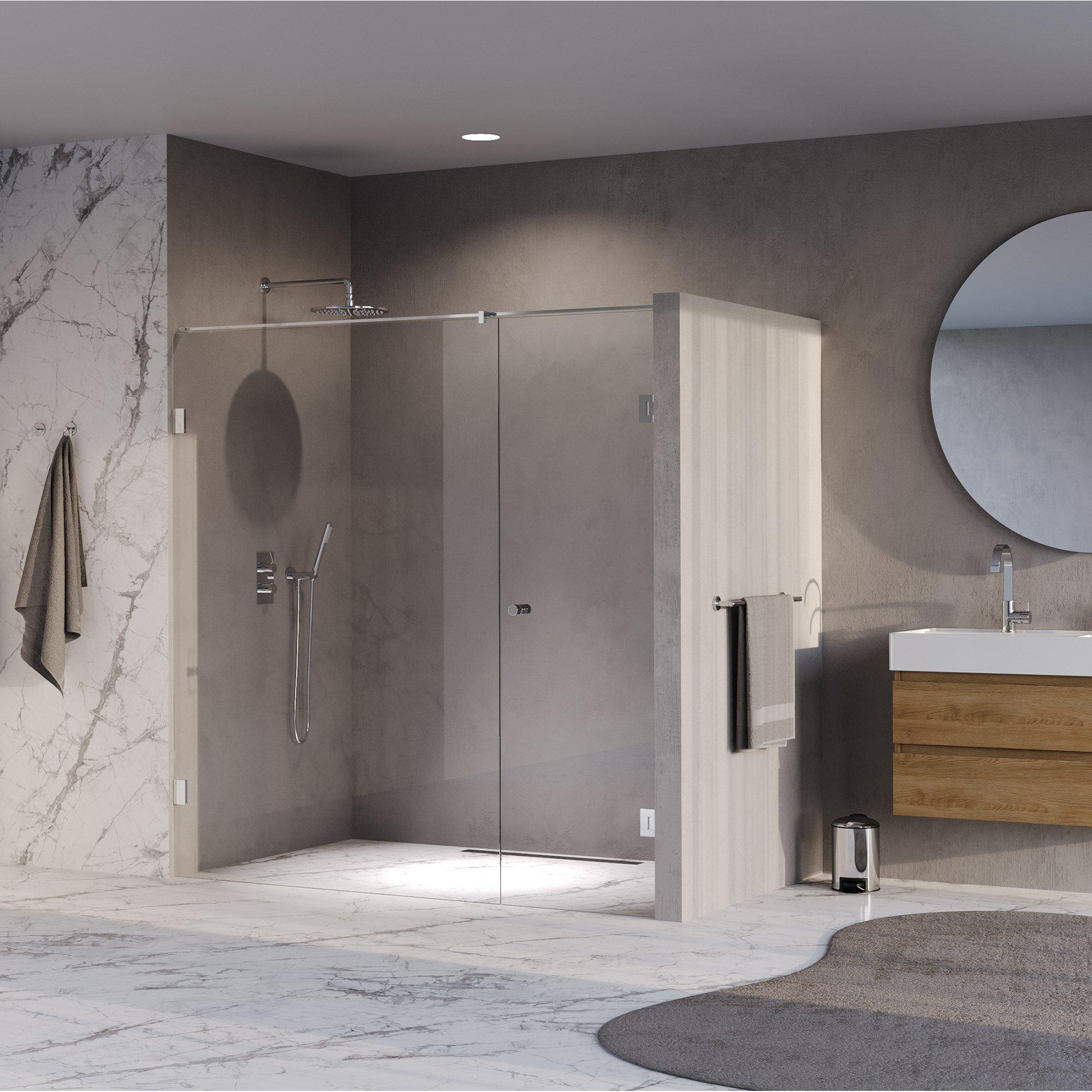 Met zijn strakke lijnen en hoogglans chroomafwerking geeft deze nisdeur jouw badkamer een moderne en luxe uitstraling. Het heldere glas zorgt voor een open en ruimtelijk gevoel, waardoor zelfs kleinere badkamers groter lijken. De minimalistische vormgeving past moeiteloos bij diverse interieurstijlen, van eigentijds tot klassiek. Door de hoogwaardige materialen en het verfijnde design straalt de deur kwaliteit en klasse uit, wat bijdraagt aan een aangename sfeer waarin je elke dag met plezier begint en eindigt.