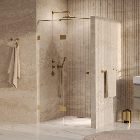 De combinatie van helder glas met een geborstelde goudkleurige PVD-coating geeft deze nisdeur een tijdloze en chique uitstraling. Dit maakt het een echte blikvanger in jouw badkamer, die moeiteloos past bij zowel moderne als klassieke interieurstijlen. Het subtiele goud voegt een vleugje luxe toe zonder te overheersen, waardoor je badkamer een warme en uitnodigende sfeer krijgt. Door het minimalistische design blijft de ruimte licht en open ogen, wat bijdraagt aan een gevoel van rust en ruimte. Zo geniet je niet alleen van een functionele douchedeur, maar ook van een stijlvol element dat jouw badkamer naar een hoger niveau tilt.