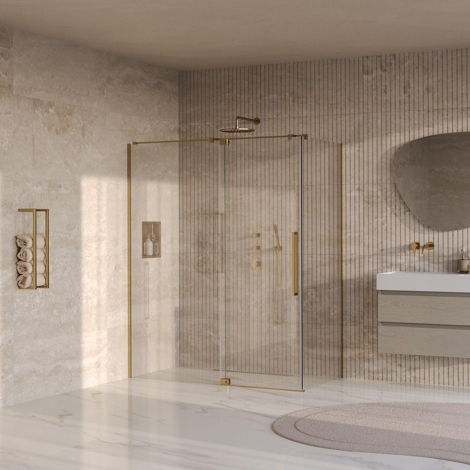 Deze douchecabine valt direct op door zijn verfijnde uitstraling. Het heldere glas in combinatie met de geborstelde goudkleurige PVD-afwerking geeft een warme, luxe touch die je badkamer een exclusieve sfeer geeft. Door het minimalistische design en de hoogwaardige materialen past deze cabine perfect bij zowel moderne als klassieke badkamers. Je creëert een stijlvolle ruimte waar je trots op kunt zijn, zonder concessies te doen aan functionaliteit of comfort.