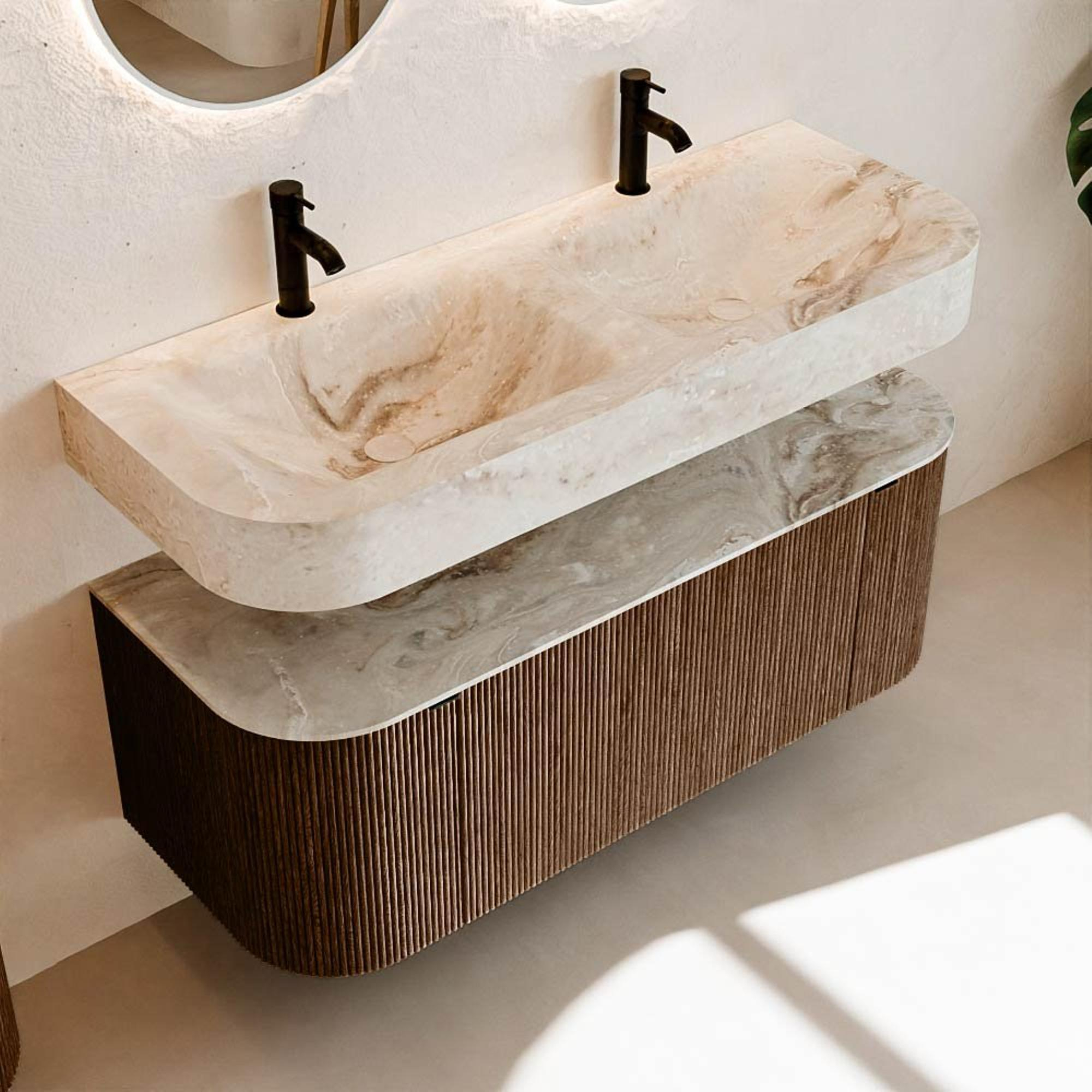 MONDIAZ THOR-DLUX 120cm badmeubel ronding links + rechts kleur Walnut met 1 lade en 2 deuren. Vrijhangende wastafel CLOUD Dubbel 2 kraangaten kleur Frappe.