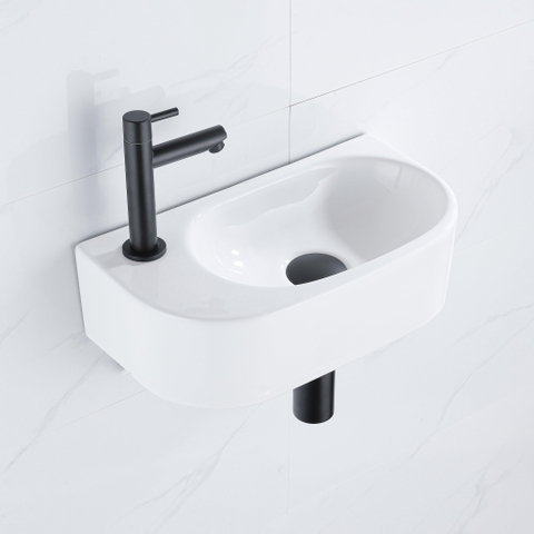 QeramiQ Fuente Fonteinset - 40x21.5x12cm - links - glad - halfrond - 1 kraangat - keramiek - fonteinkraan wit mat - afvoerplug - verlaagd sifon - wit glans