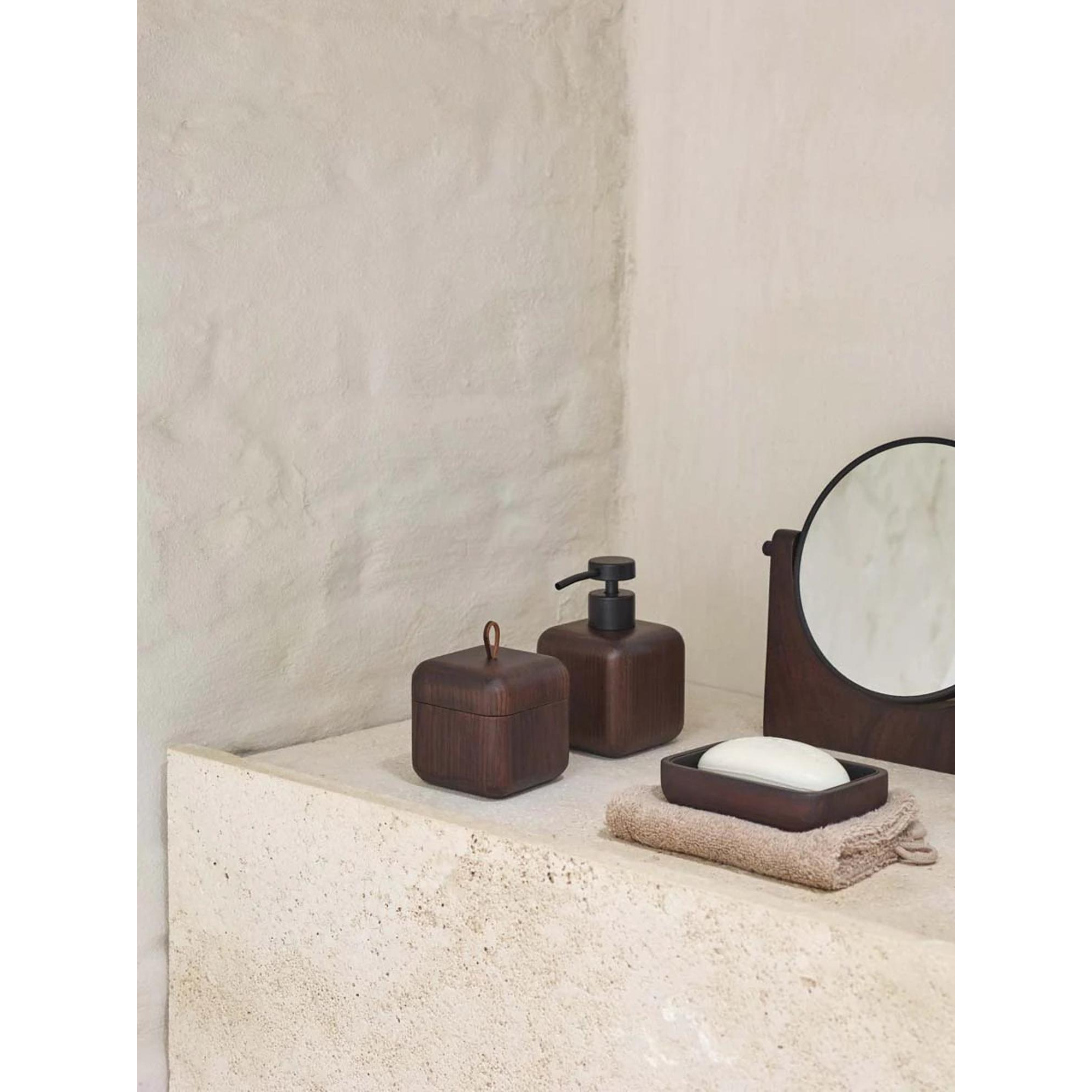 De Aquanova Ebony zeepdispenser in de kleur Pecan-538 is een stijlvolle en functionele toevoeging aan je badkamer of keuken. Deze handgemaakte dispenser uit de Ebony-serie heeft de kenmerkende afgeronde kubusvorm met afmetingen van 8 x 8 cm en een hoogte van 13 cm. Het gebruik van donker ebbenhout geeft de dispenser een stoere, chique en natuurlijke uitstraling, waarbij de fijne houtstructuur prachtig zichtbaar blijft.De dispenser heeft een inhoud van 150 ml en is voorzien van een zwart pompje van roestvrij staal, wat zorgt voor een moderne en luxe afwerking. De neutrale donkerbruine kleur Pecan past moeiteloos in uiteenlopende interieurstijlen en combineert perfect met andere accessoires uit de Ebony-serie. Ideaal voor vloeibare handzeep of lotion.