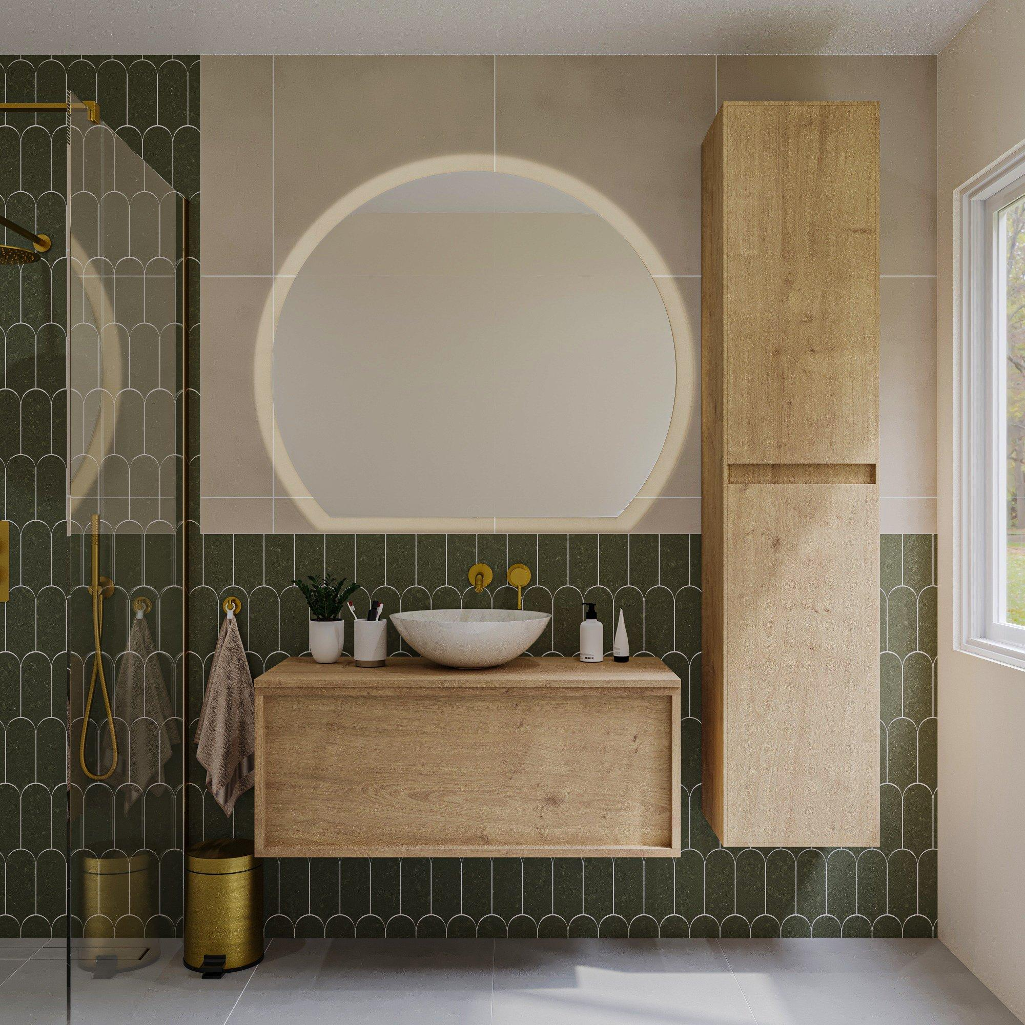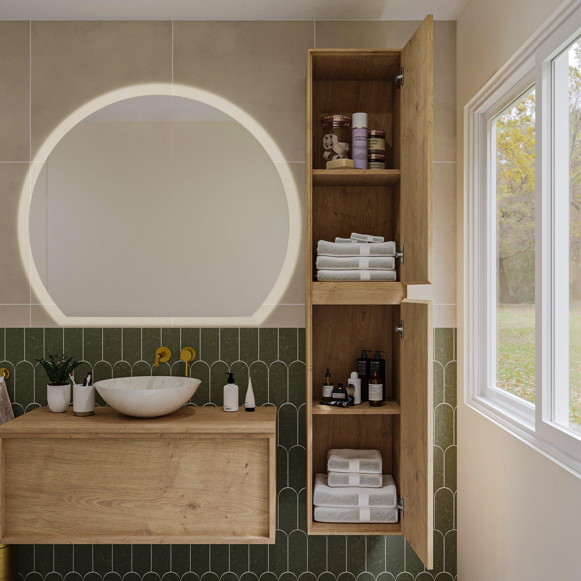Deze hoge kast straalt pure elegantie uit dankzij het gebruik van massief eikenhout met een natuurlijke afwerking. De warme houttinten brengen een rustgevende sfeer in je badkamer en passen moeiteloos bij diverse interieurstijlen, van modern tot klassiek. De strakke lijnen en het minimalistische design zorgen ervoor dat de kast een tijdloze blikvanger is zonder te overheersen. Zo creëer je een harmonieus geheel waarin jouw badkamer er altijd verzorgd en uitnodigend uitziet. Met dit meubel voeg je niet alleen opbergruimte toe, maar ook een stukje natuurlijke schoonheid dat je badkamer een unieke uitstraling geeft.