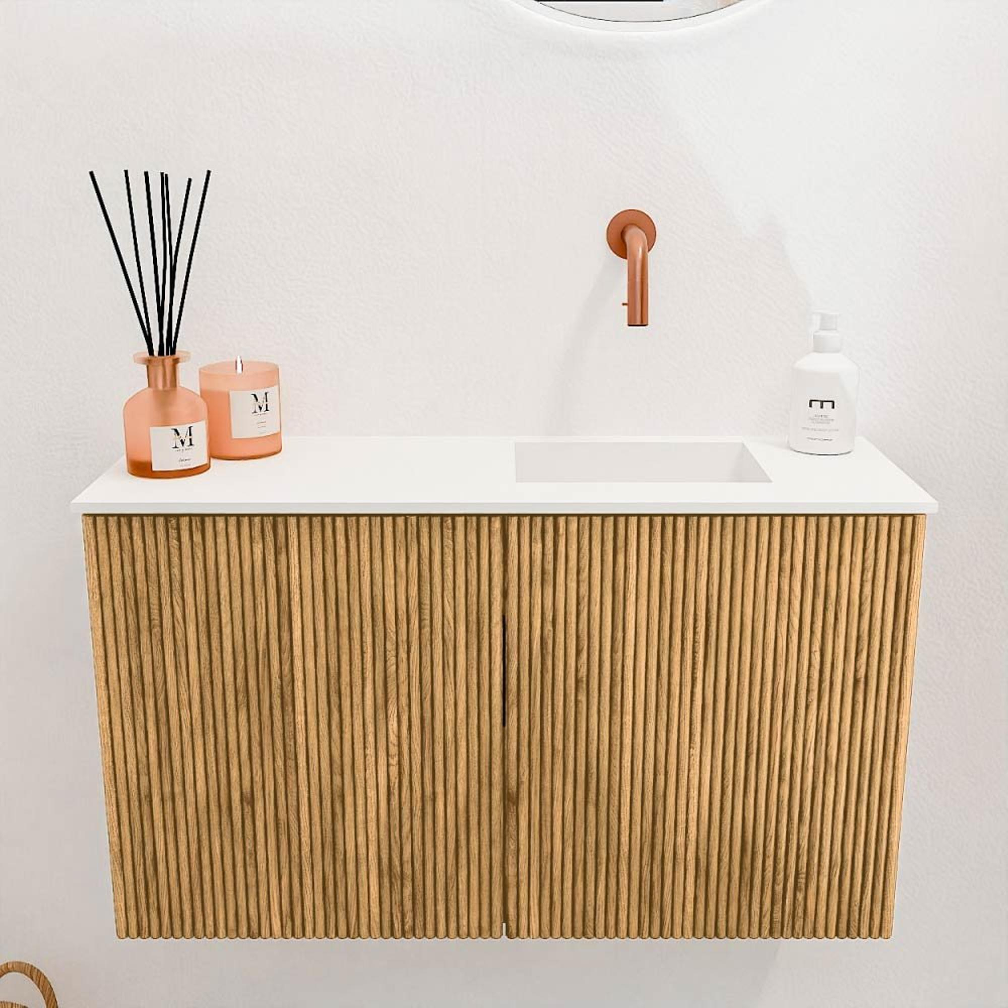 Met dit prachtige meubel geef je jouw badkamer direct een warme en natuurlijke uitstraling. Het compacte formaat van 70 cm breed maakt het ideaal voor kleinere ruimtes, zoals een gastentoilet of een compacte badkamer, zonder in te leveren op stijl of functionaliteit. De combinatie van een wastafel met een subtiele, rechtse positie en een meubel in de warme kleur Oak zorgt voor een tijdloze en elegante sfeer. De afwerking in Talc zorgt voor een frisse, lichte toets die perfect samengaat met het natuurlijke hout. Dankzij de slimme indeling en het doordachte ontwerp creëer je eenvoudig extra opbergruimte, zodat je badkamer altijd netjes en overzichtelijk blijft. Dit meubel is niet alleen mooi om te zien, maar ook praktisch in gebruik en eenvoudig te monteren aan de wand, wat zorgt voor een ruimtelijk effect en een moderne uitstraling.