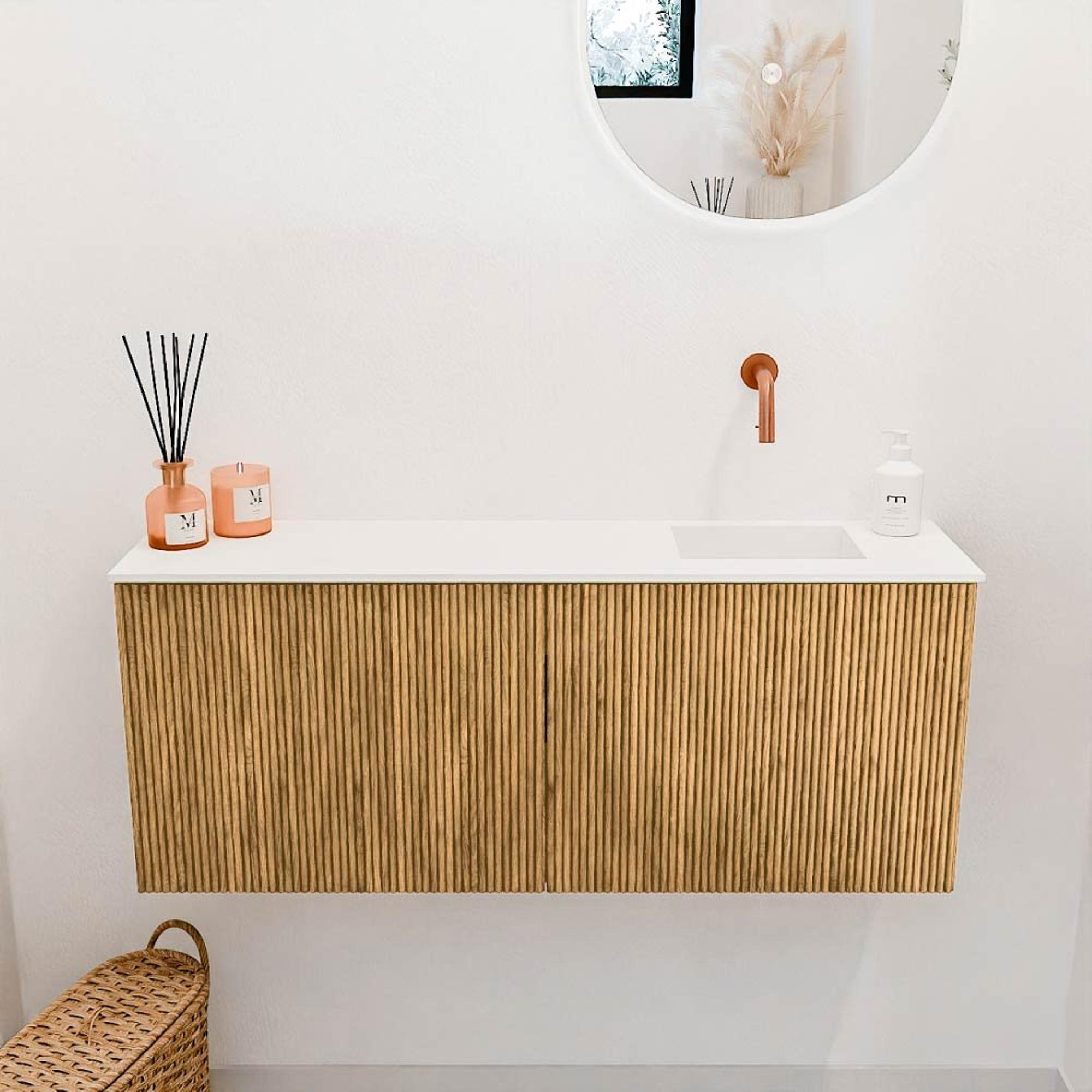 Transformeer jouw badkamer of gastentoilet met dit prachtige meubel dat niet alleen praktisch is, maar ook een warme en natuurlijke sfeer toevoegt. Dankzij de combinatie van massief eikenhout en eikenfineer straalt het meubel een tijdloze kwaliteit uit die je badkamer direct een stijlvolle upgrade geeft. De subtiele verticale groeven op het front zorgen voor een moderne, ribbelige uitstraling die het geheel een eigentijdse twist geeft. Met een breedte van 100 cm biedt het meubel voldoende opbergruimte om jouw badkamer netjes en overzichtelijk te houden, terwijl de wastafel met de kraan aan de rechterkant zorgt voor optimaal gebruiksgemak. Het ontbreken van een kraangat geeft je bovendien de vrijheid om zelf een kraan naar keuze te plaatsen, helemaal afgestemd op jouw stijl en wensen. Zo geniet je niet alleen van een functionele oplossing, maar ook van een meubel dat jouw persoonlijke smaak perfect weerspiegelt.