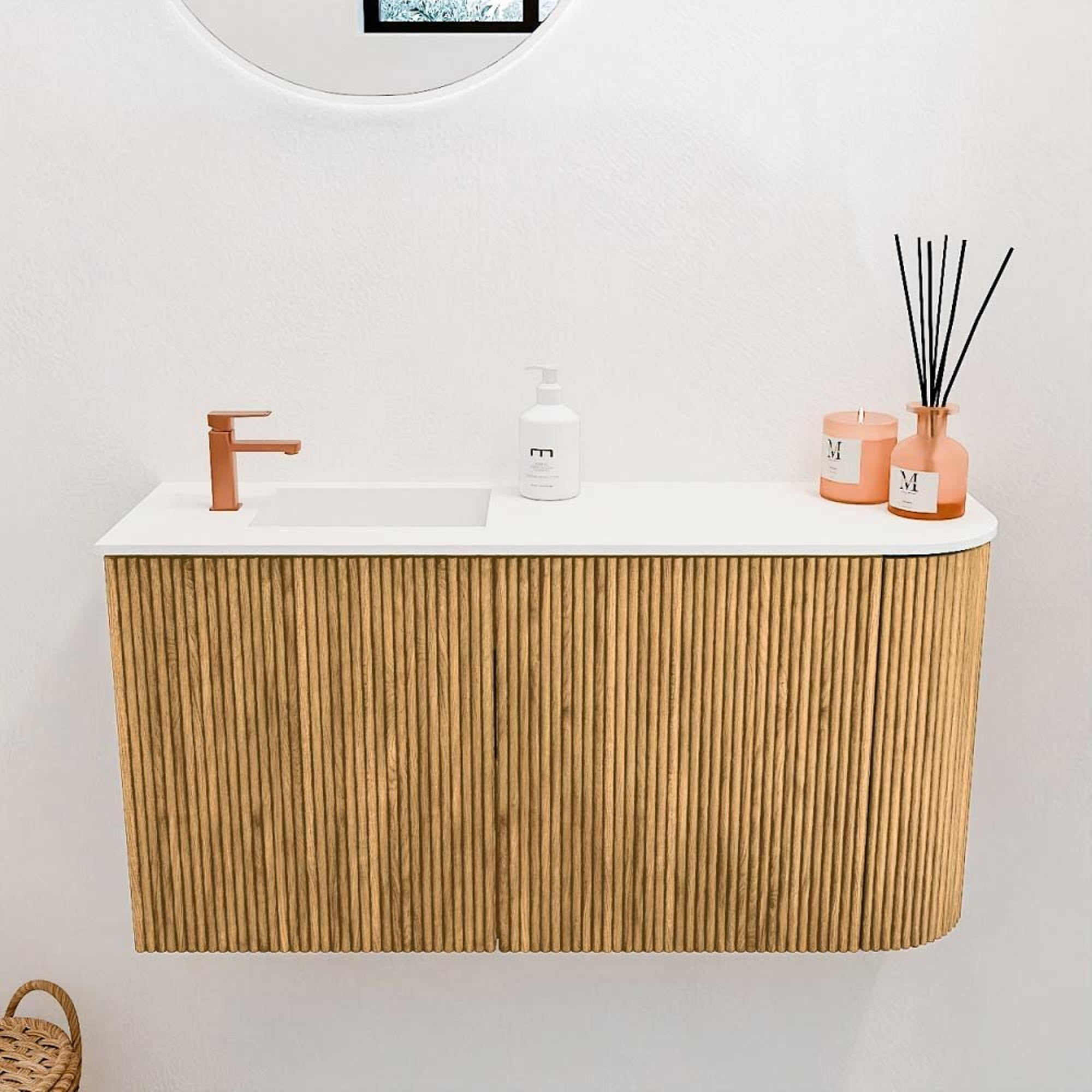 Het meubel valt direct op door zijn verfijnde verticale ribbelstructuur en de warme eikenhoutkleur. Deze combinatie zorgt voor een tijdloze en toch eigentijdse uitstraling die moeiteloos in verschillende badkamerstijlen past. Dankzij de subtiele ronding aan de rechterzijde krijgt het meubel een uniek karakter, waardoor jouw badkamer een persoonlijke touch krijgt. Dit meubel is niet zomaar functioneel, het is een designstatement dat jouw badkamer naar een hoger niveau tilt.