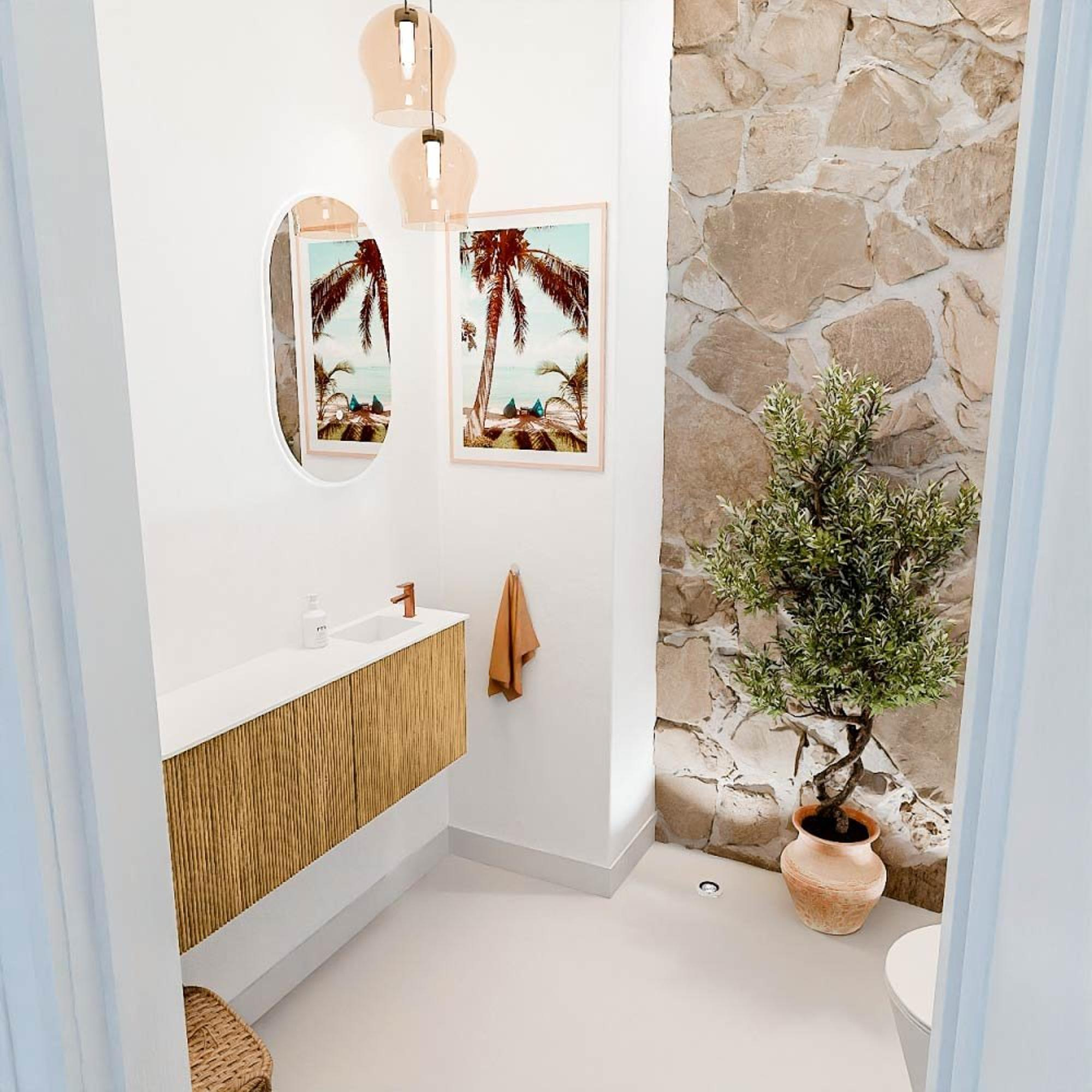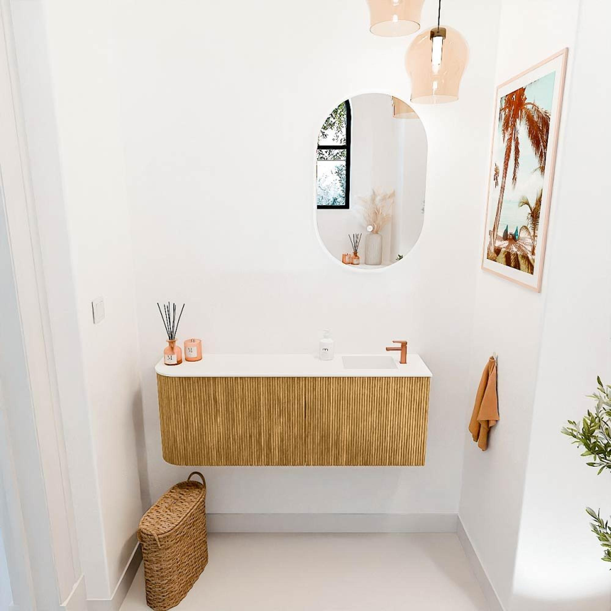 Dit meubel is een toonbeeld van tijdloze elegantie. De combinatie van massief eikenhout met een subtiele ronding aan de linkerkant geeft jouw badkamer een warme en natuurlijke uitstraling. De talc-kleurige wastafel voegt een zachte, moderne touch toe die moeiteloos aansluit bij diverse interieurstijlen. Door het ribbelfront krijgt het meubel een speels en toch verfijnd karakter. Zo geniet je niet alleen van een functioneel meubel, maar ook van een echte blikvanger die jouw badkamer een luxe uitstraling geeft.