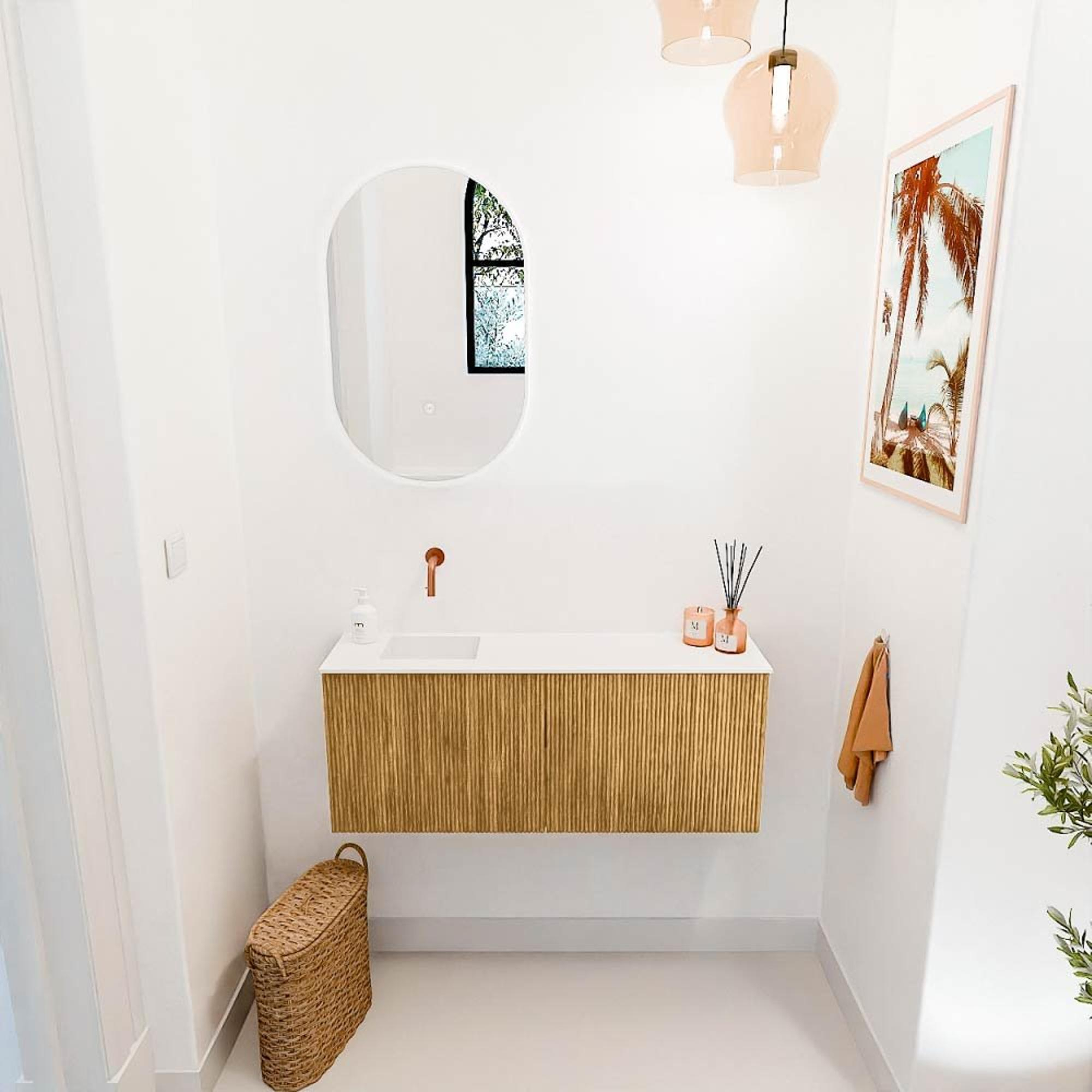 De warme eikenkleur van het meubel combineert moeiteloos met de zachte talc-wastafel, waardoor een tijdloze en elegante uitstraling ontstaat. Dit ontwerp past zowel in moderne als klassieke badkamers en voegt direct sfeer toe. De ribbelstructuur op de fronten geeft een subtiel speels effect zonder afbreuk te doen aan de rust en eenvoud. Zo geniet je van een meubel dat niet alleen mooi is om te zien, maar ook jouw badkamer een persoonlijke touch geeft. Met dit stijlvolle meubel maak je een bewuste keuze voor kwaliteit en design die jarenlang meegaat.