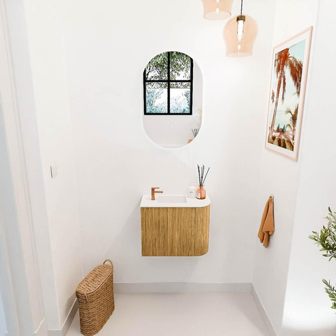 Het meubel valt meteen op door zijn elegante en tijdloze uitstraling. De warme eikenkleur in combinatie met de zachte talc-kleur van de wastafel zorgt voor een harmonieus geheel dat moeiteloos in diverse interieurstijlen past. De geribbelde fronten geven een subtiele textuur die het meubel net dat beetje extra karakter geeft. Zo creëer je een badkamer die niet alleen praktisch is, maar ook uitnodigt om te ontspannen en te genieten. Met dit design haal je een echte blikvanger in huis die je badkamer een luxe en verzorgde uitstraling geeft.