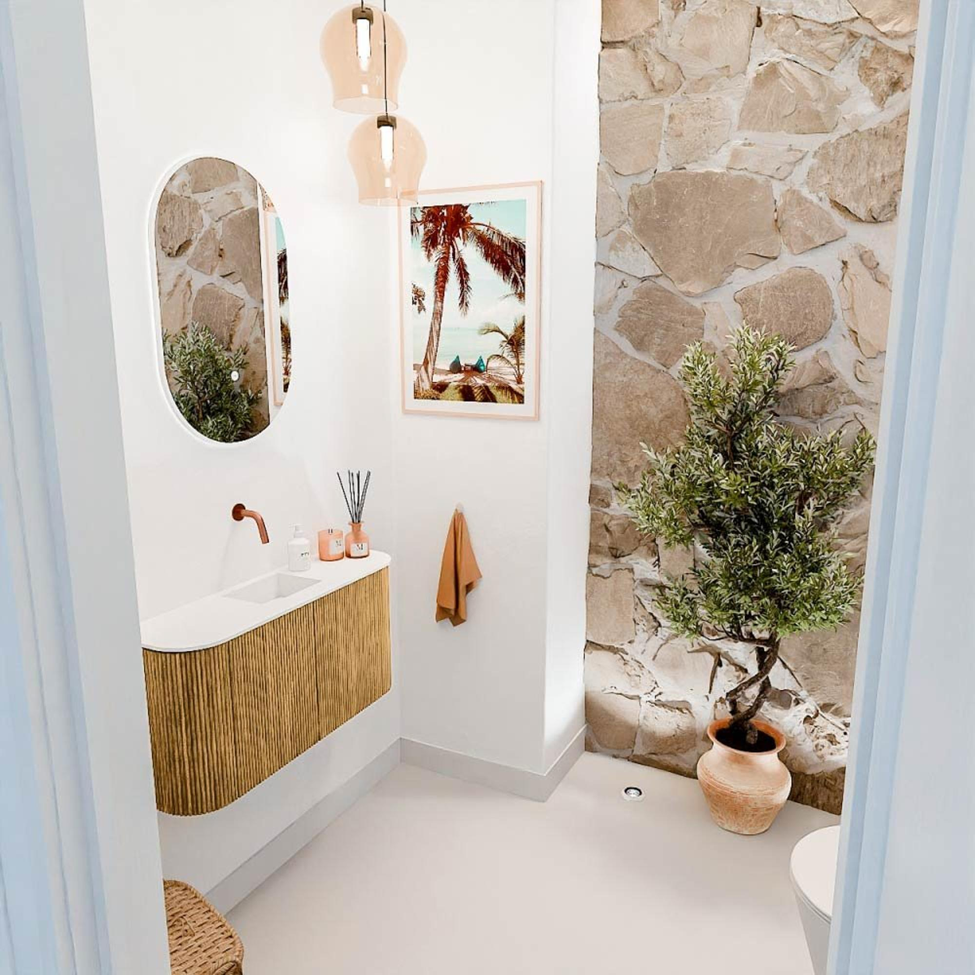 Met dit prachtige meubel geef je jouw badkamer direct een warme en natuurlijke uitstraling. Het combineert de tijdloze charme van echt eikenhout met een modern, functioneel ontwerp dat perfect past in uiteenlopende badkamers. Dankzij de subtiele rondingen aan beide zijden oogt het meubel niet alleen elegant, maar ook uitnodigend. De wastafel in een zachte talc-kleur voegt een frisse, lichte toets toe die moeiteloos samengaat met het warme hout. Dit meubel is ideaal voor wie houdt van een stijlvolle, maar praktische badkameroplossing. Het biedt voldoende opbergruimte om jouw badkamer netjes en overzichtelijk te houden, terwijl het compacte formaat van 83,2 cm breed perfect is voor zowel kleinere als grotere ruimtes. Door de wandmontage creëer je bovendien een ruimtelijk effect, waardoor je badkamer groter en luchtiger aanvoelt. Zo geniet je elke dag van een badkamer die niet alleen mooi is om te zien, maar ook heerlijk functioneel en comfortabel in gebruik.