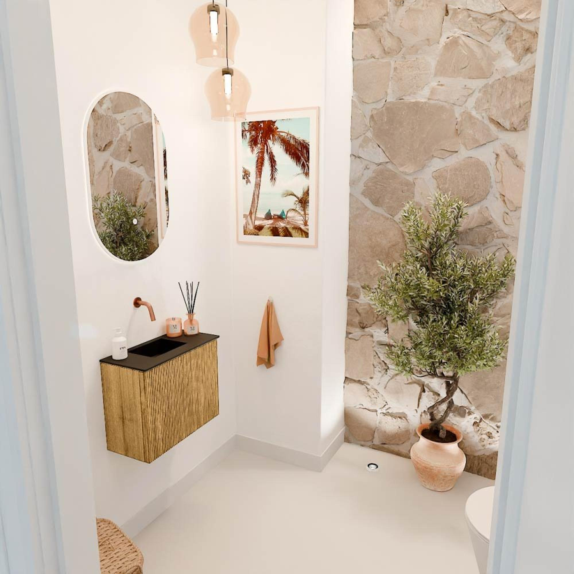 Met dit prachtige meubel geef je jouw toilet een warme, natuurlijke uitstraling die direct opvalt. Het compacte formaat van 50 cm breed maakt het ideaal voor kleinere ruimtes, zonder in te leveren op stijl of functionaliteit. Dankzij de hoogwaardige afwerking in eikenhout straalt het meubel een tijdloze elegantie uit die moeiteloos past bij diverse interieurstijlen. De wastafel is slim gepositioneerd aan de linkerkant, wat zorgt voor een praktische indeling en optimaal gebruiksgemak. Zonder kraangat biedt het bovendien de vrijheid om zelf een kraan te kiezen die perfect aansluit bij jouw wensen. Dit meubel transformeert jouw badkamerhoekje tot een sfeervolle plek waar je elke dag met plezier begint.