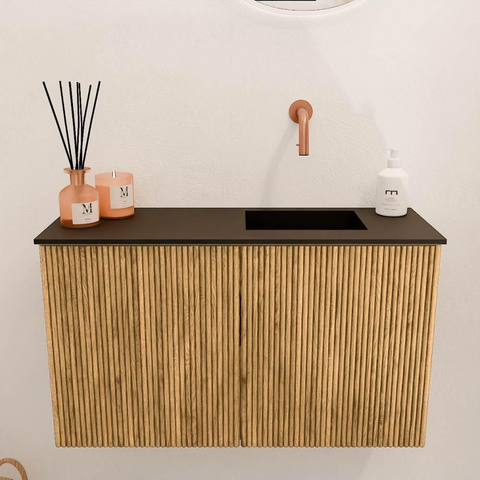Het meubel valt direct op door zijn elegante ontwerp en hoogwaardige materialen. De combinatie van massief eikenhout aan de voorkant en eikenfineer aan de zijkanten geeft het een natuurlijke en luxe uitstraling. De warme oak-kleur past perfect bij diverse interieurstijlen, van modern tot klassiek. Dankzij de ribbelstructuur op de fronten krijgt het meubel een unieke textuur die subtiel opvalt zonder te overheersen. Zo voeg je een stijlvol accent toe aan je badkamer of toilet, wat direct bijdraagt aan een sfeervolle en uitnodigende ruimte.