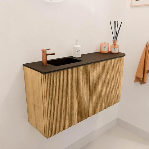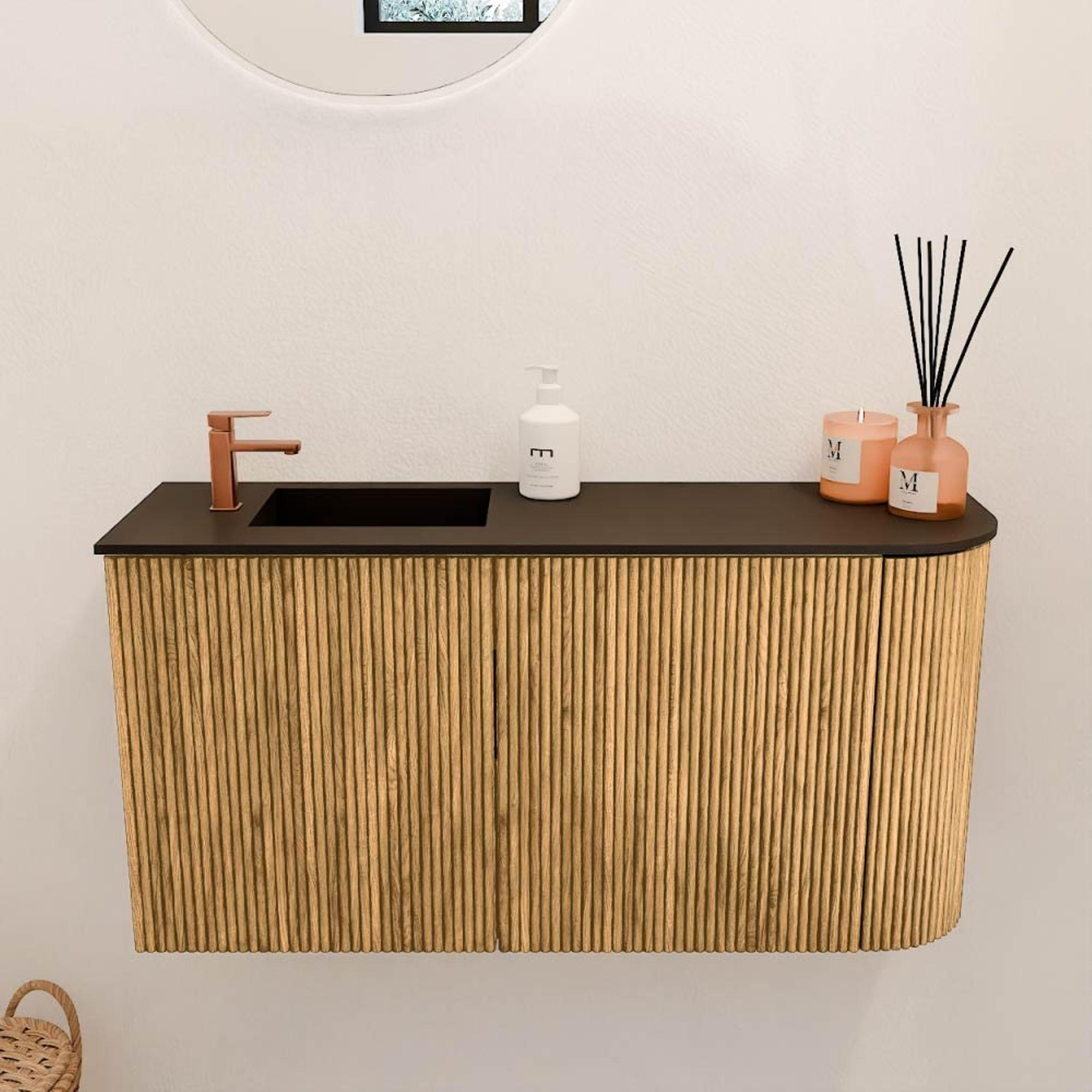 De combinatie van het warme eikenhout met de moderne urban wastafel zorgt voor een tijdloos en elegant geheel. Dit meubel past moeiteloos in uiteenlopende interieurstijlen, van klassiek tot industrieel. De subtiele ronding aan de rechterkant geeft het meubel een uniek karakter en maakt het visueel aantrekkelijk zonder te overheersen. Door de doordachte kleurkeuze en het strakke design creëer je een badkamer die rust en harmonie uitstraalt. Zo wordt jouw badkamer niet alleen functioneel, maar ook een plek waar je graag tijd doorbrengt.