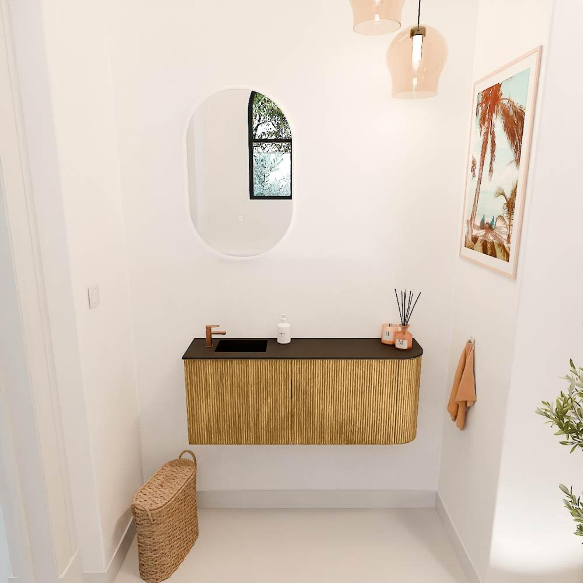 Het meubel valt meteen op door het elegante ontwerp met een subtiele ronding aan de rechterzijde. De combinatie van massief eikenhout en eikenfineer geeft het een warme, natuurlijke uitstraling die perfect past in zowel moderne als klassieke badkamers. De verticale groeven op de fronten zorgen voor een speels en eigentijds accent, waardoor het meubel een echte blikvanger wordt. Door deze stijlvolle details voeg je direct sfeer en karakter toe aan je ruimte, zonder dat het te druk wordt. Zo geniet je van een badkamer die niet alleen functioneel is, maar ook uitnodigt om te ontspannen.