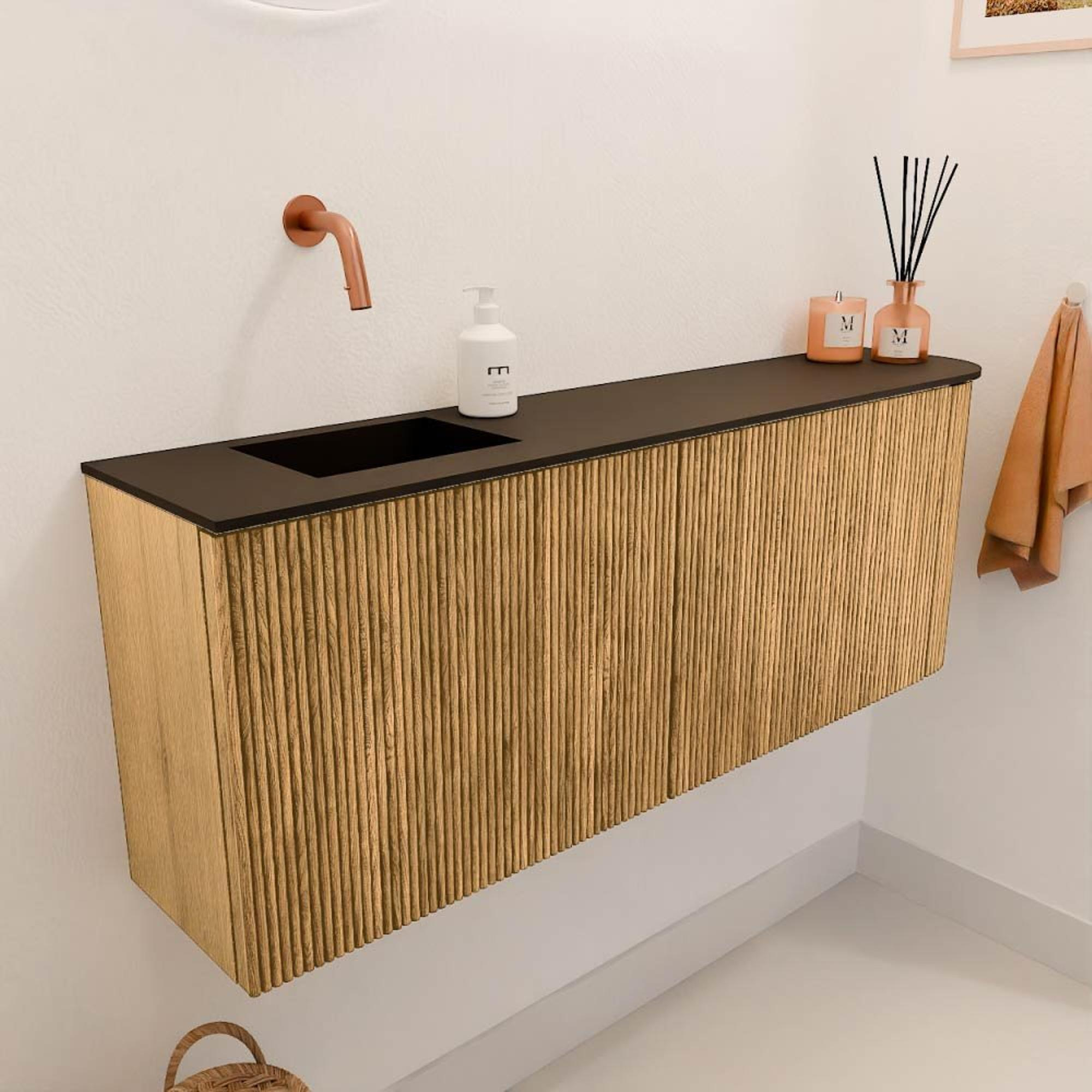 De warme eikenhoutkleur en het ribbelfront maken dit meubel tot een echte blikvanger. Het natuurlijke materiaal straalt rust en kwaliteit uit, waardoor je badkamer meteen een uitnodigende sfeer krijgt. De subtiele ronding aan de rechterkant geeft het meubel een eigentijdse twist zonder te overheersen. Zo voeg je moeiteloos een stijlvol element toe dat zowel modern als tijdloos is. Dit maakt het meubel geschikt voor diverse badkamerstijlen, van landelijk tot industrieel. Bovendien zorgt de wandmontage voor een zwevend effect, wat de ruimte optisch vergroot en een luxe uitstraling geeft.