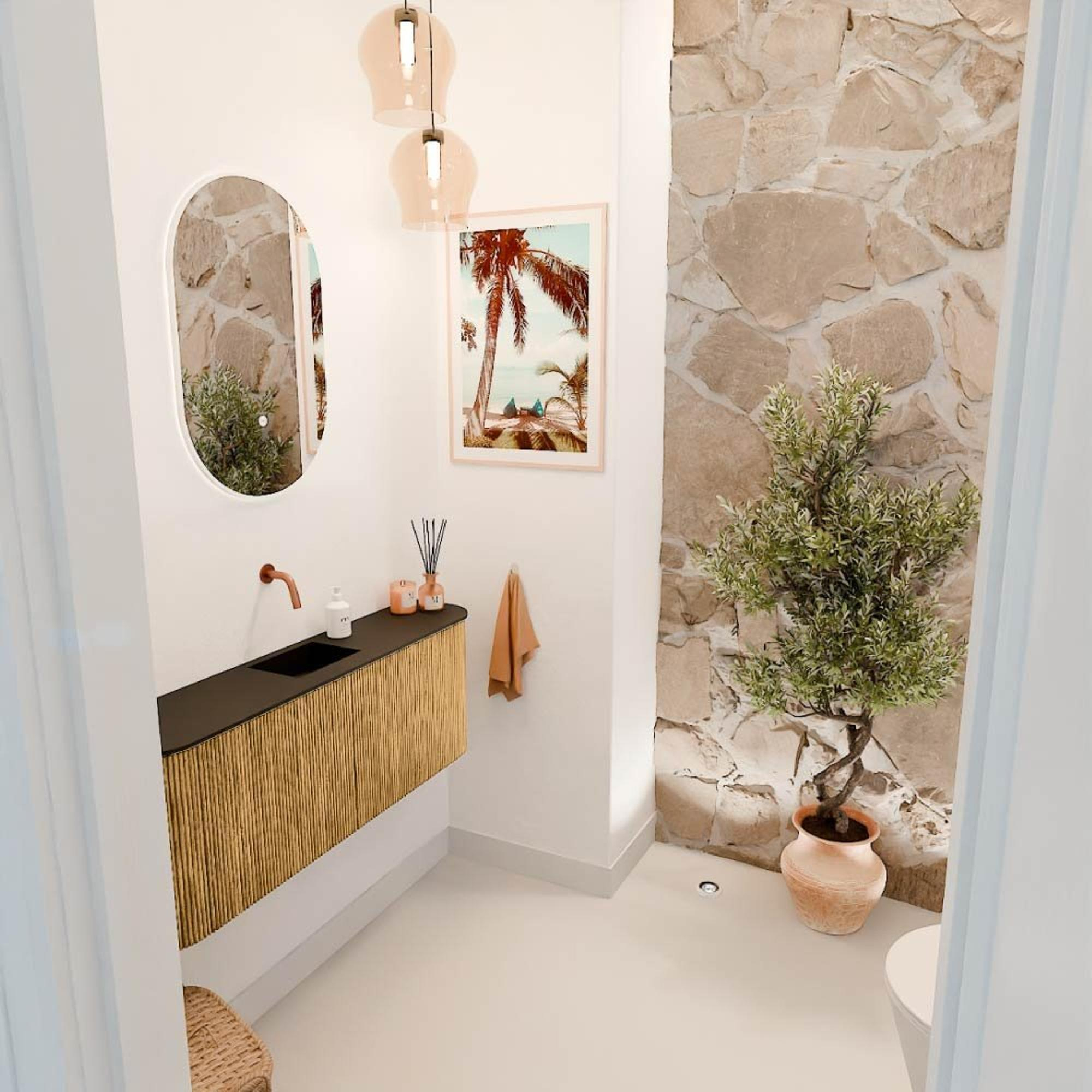 De combinatie van massief eikenhout en eikenfineer geeft het meubel een natuurlijke en warme uitstraling die nooit uit de mode raakt. De verticale groeven op de frontpanelen zorgen voor een subtiel, maar opvallend detail dat het meubel karakter en diepte geeft. De afgeronde zijkanten maken het ontwerp uniek en zorgen voor een zachte overgang in je badkamerinterieur. Dit meubel past moeiteloos in zowel klassieke als moderne badkamers, waardoor je verzekerd bent van een tijdloos en stijlvol element dat jarenlang meegaat.