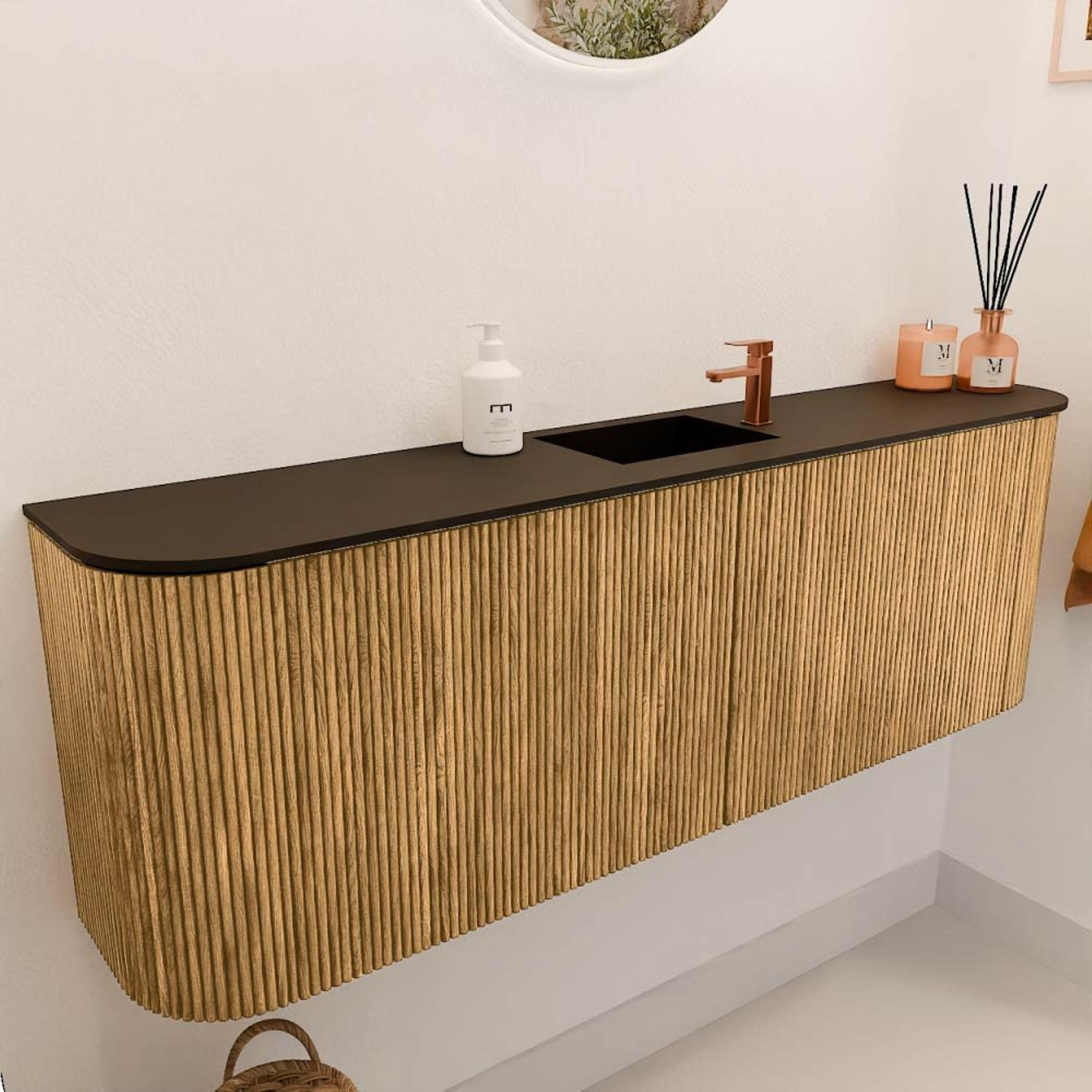 De elegante rondingen aan zowel de linker- als rechterzijde geven het meubel een unieke en verfijnde uitstraling. Dit zorgt ervoor dat het meubel niet alleen functioneel is, maar ook een echte blikvanger in je badkamer. De combinatie van de warme Oak-kleur met het stoere Urban van de wastafel maakt het geheel bijzonder stijlvol en tijdloos. Zo voeg je moeiteloos een vleugje luxe toe aan jouw badkamerinterieur, wat de waarde van je woning kan verhogen.