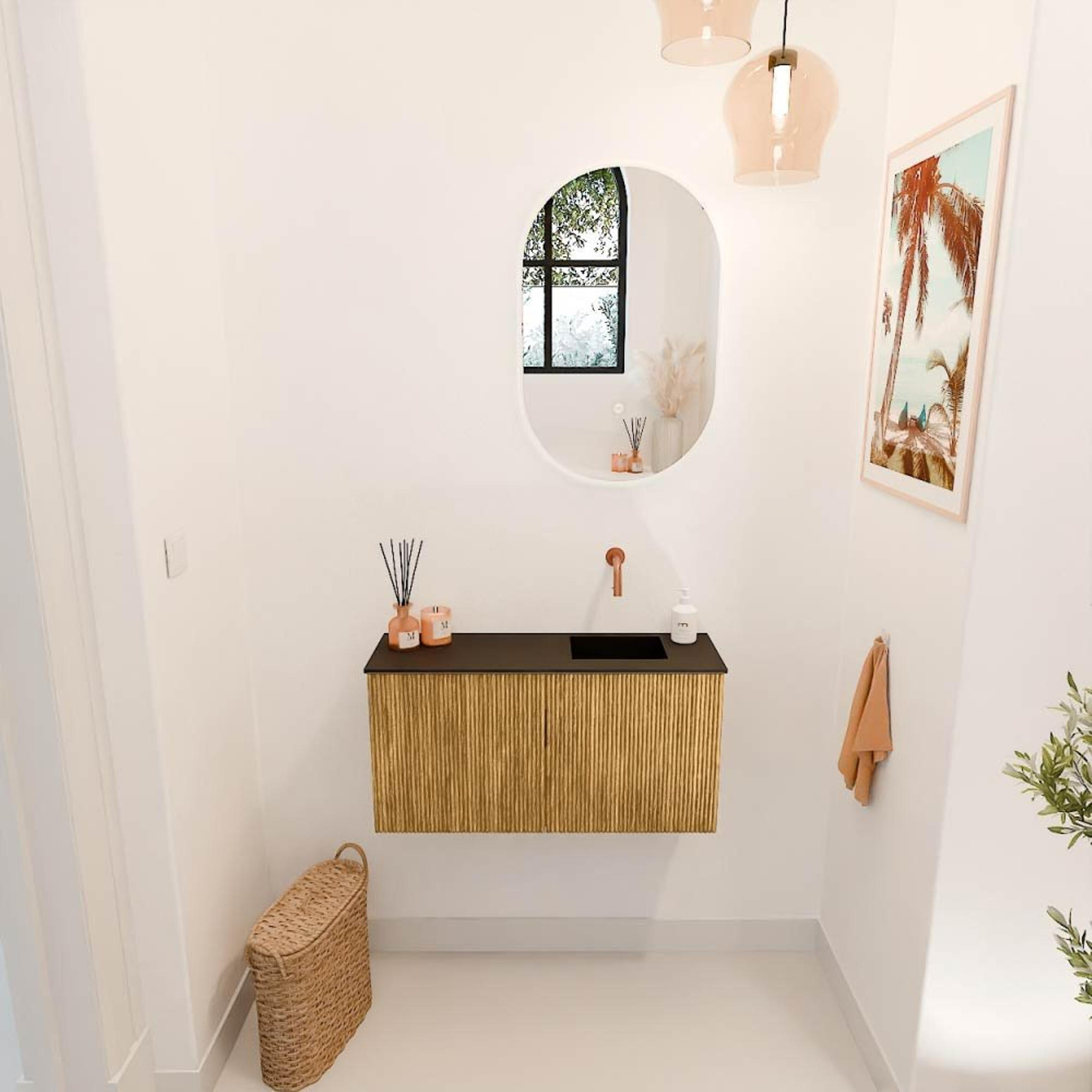 De warme eikenhouten afwerking met een urban zwarte wastafel geeft dit meubel een unieke uitstraling die zowel modern als tijdloos is. De ribbelstructuur op de fronten voegt een subtiel speels element toe, waardoor het meubel direct in het oog springt zonder te overheersen. Dit maakt het een echte blikvanger in jouw badkamer, die moeiteloos aansluit bij diverse interieurstijlen. Dankzij het minimalistische design en de hoogwaardige materialen geniet je van een meubel dat niet alleen mooi is, maar ook een gevoel van rust en luxe uitstraalt.