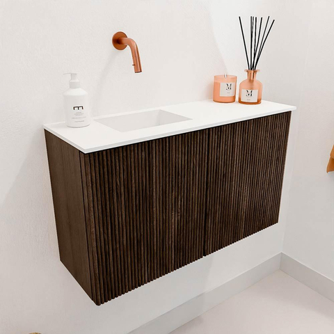 Mondiaz JOYA 70cm toiletmeubel - kleur Walnut - Wastafel FAYE positie Links Zonder kraangat kleur Talc.
