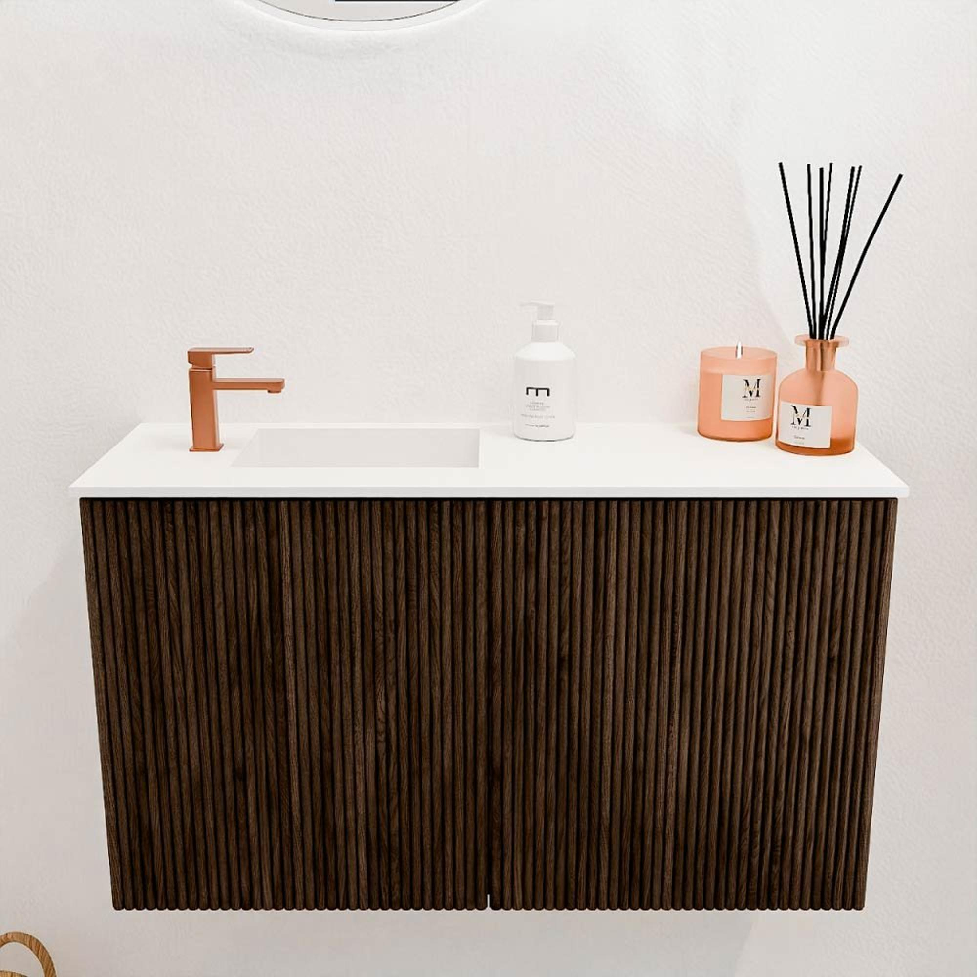 Het meubel valt direct op door het elegante walnootdecor met een moderne, verticale ribbelstructuur op de deuren. Deze subtiele details geven het geheel een luxe uitstraling die moeiteloos aansluit bij verschillende interieurstijlen. Of je nu kiest voor een strakke, moderne badkamer of juist een warme, natuurlijke sfeer wilt creëren, dit meubel past perfect. De combinatie van warme houttinten en het lichte wastafelblad zorgt voor een mooi contrast dat rust en balans brengt in jouw ruimte.