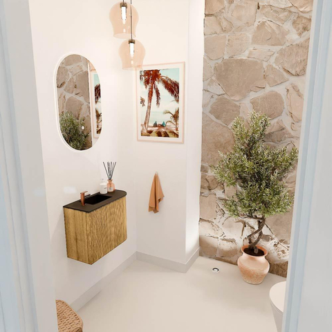 Met dit compacte en stijlvolle meubel geef je jouw badkamer of gastentoilet direct een warme en moderne uitstraling. Het meubel combineert een praktische afmeting met een doordacht ontwerp, waardoor het perfect past in kleinere ruimtes zonder in te leveren op comfort of uitstraling. De subtiele ronding aan de rechterkant zorgt voor een speels en elegant detail, terwijl de warme eikenkleur een natuurlijke sfeer toevoegt. De wastafel met één kraangat aan de linkerkant maakt het gebruik eenvoudig en functioneel. Zo creëer je een ruimte die niet alleen mooi oogt, maar ook prettig in gebruik is. Dit meubel tilt jouw badkamer naar een hoger niveau en maakt het dagelijks gebruik een stuk aangenamer.