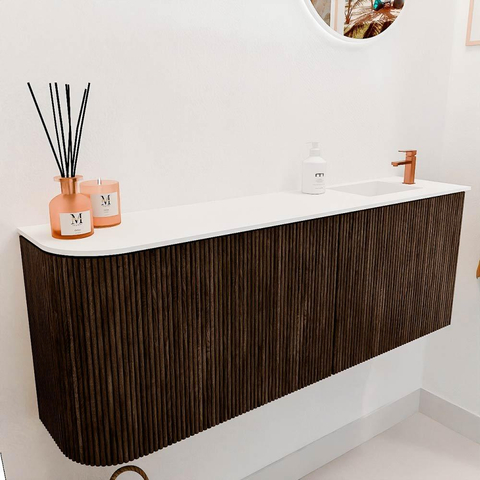 Het meubel valt direct op door de warme walnootkleurige afwerking en de verticale ribbelstructuur op de frontpanelen. Deze combinatie geeft het geheel een luxe en natuurlijke uitstraling die perfect past in diverse badkamerstijlen. De wastafel in zachte Talc-kleur vormt een subtiel contrast en benadrukt het hoogwaardige design. Zo voeg je met dit meubel een tijdloos element toe dat jarenlang mooi blijft en moeiteloos aansluit bij jouw persoonlijke smaak en de rest van je badkamerinrichting.