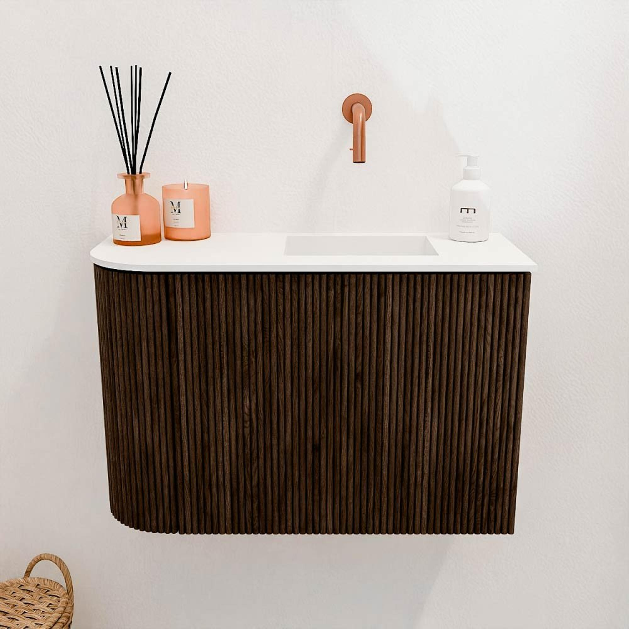 Dit meubel is een toonbeeld van verfijnde stijl. De walnootkleurige afwerking met verticale ribbels op de fronten geeft het een moderne, maar warme uitstraling die moeiteloos in diverse badkamerinterieurs past. De subtiele ronding aan de linkerkant maakt het ontwerp uniek en zorgt voor een speels effect zonder afbreuk te doen aan de rust en harmonie in je badkamer. Dankzij de combinatie van natuurlijke houttinten en een zachte talc-wastafel ontstaat een tijdloos geheel dat nooit uit de mode raakt. Zo voeg je een vleugje luxe toe aan je dagelijkse routine.Duurzaam