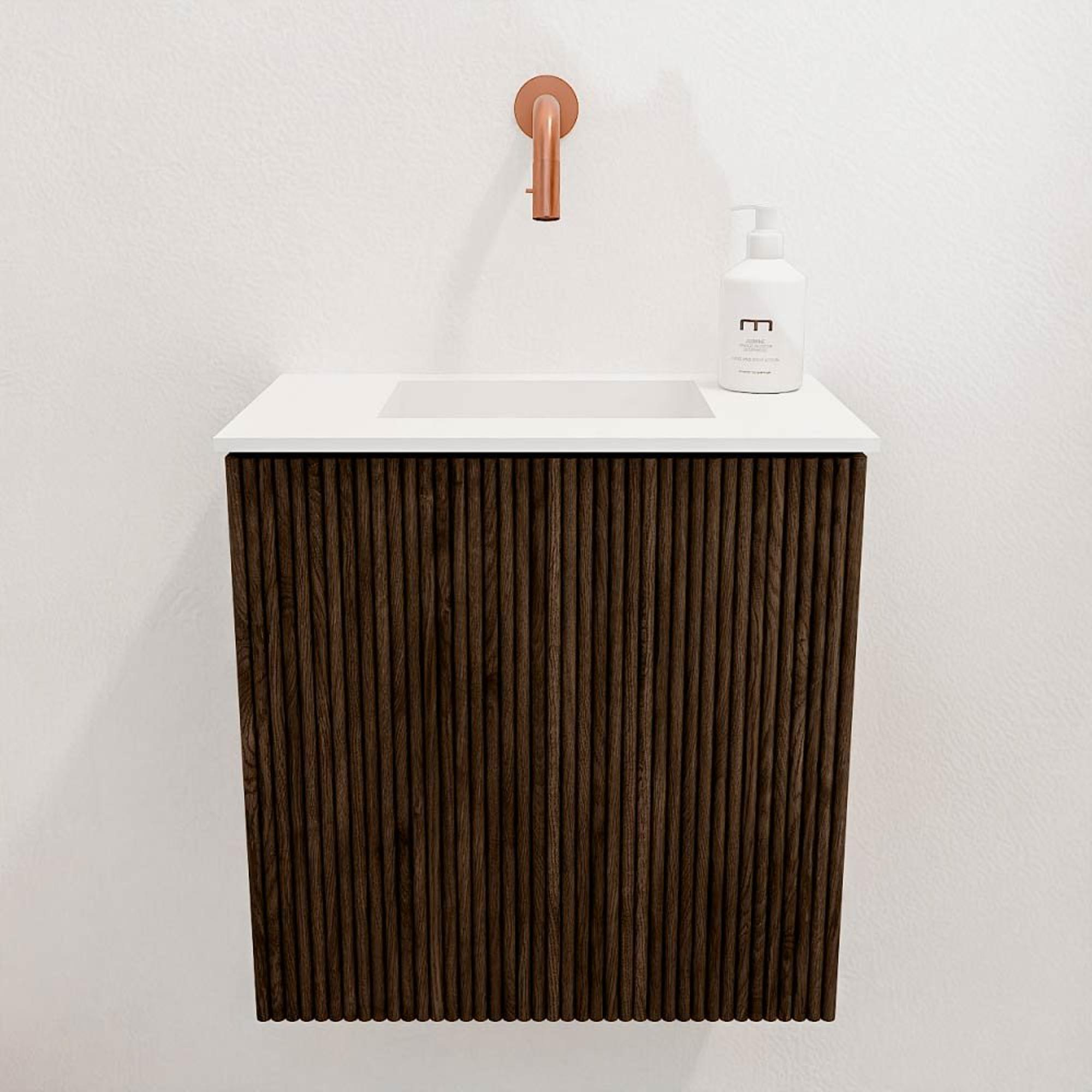 Transformeer jouw toiletruimte met dit compacte en stijlvolle meubel dat perfect past in kleinere badkamers zonder in te leveren op design of functionaliteit. Het meubel combineert een warme walnootkleur met een eigentijdse ribbelstructuur, wat direct een natuurlijke en luxe sfeer toevoegt. Dankzij de slimme afmetingen van 40 cm breed en 24,5 cm diep, benut je elke centimeter optimaal. De wastafel in een zachte talc-kleur is centraal geplaatst en zonder kraangat, waardoor je volledige vrijheid hebt in de keuze van een kraan die bij jouw stijl past. Dit meubel brengt niet alleen rust en elegantie, maar zorgt ook voor een georganiseerde en frisse uitstraling in jouw badkamer. Zo wordt elke ochtend een moment van plezier en gemak.