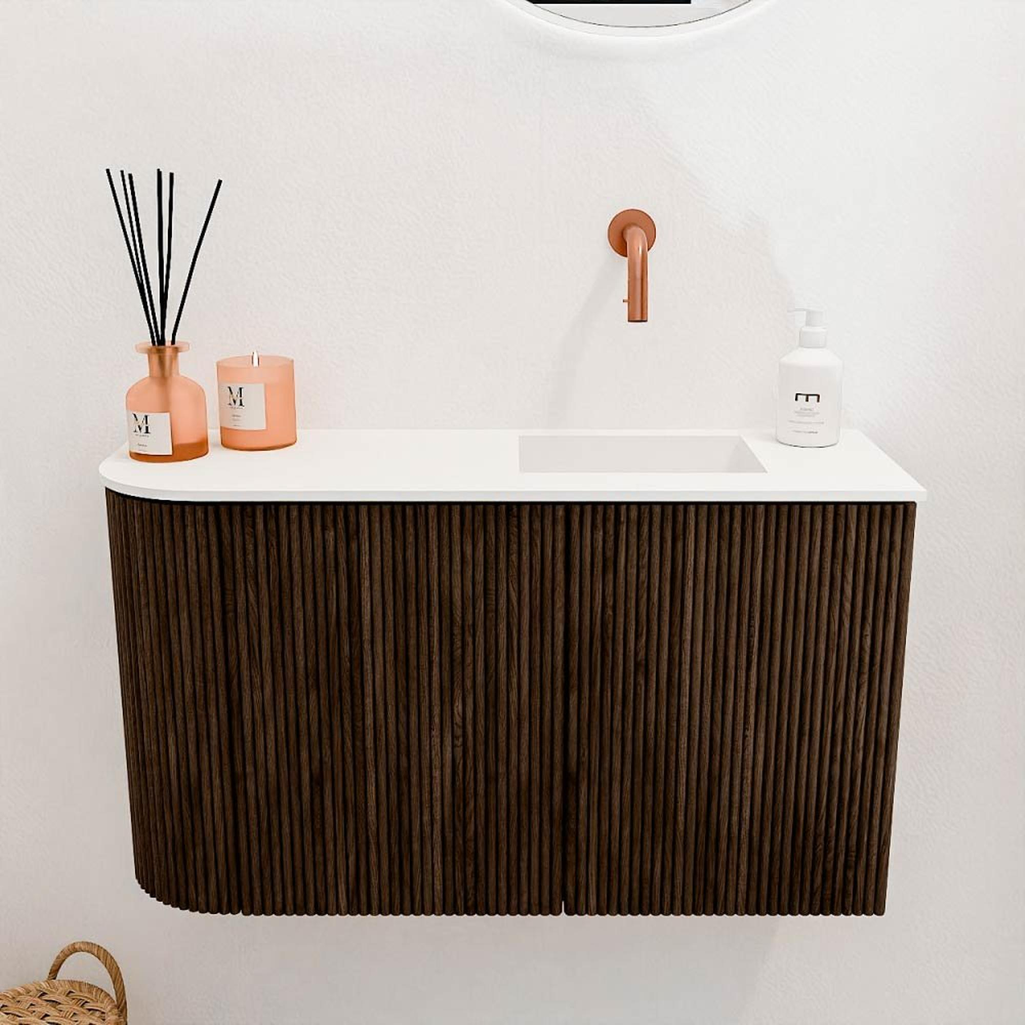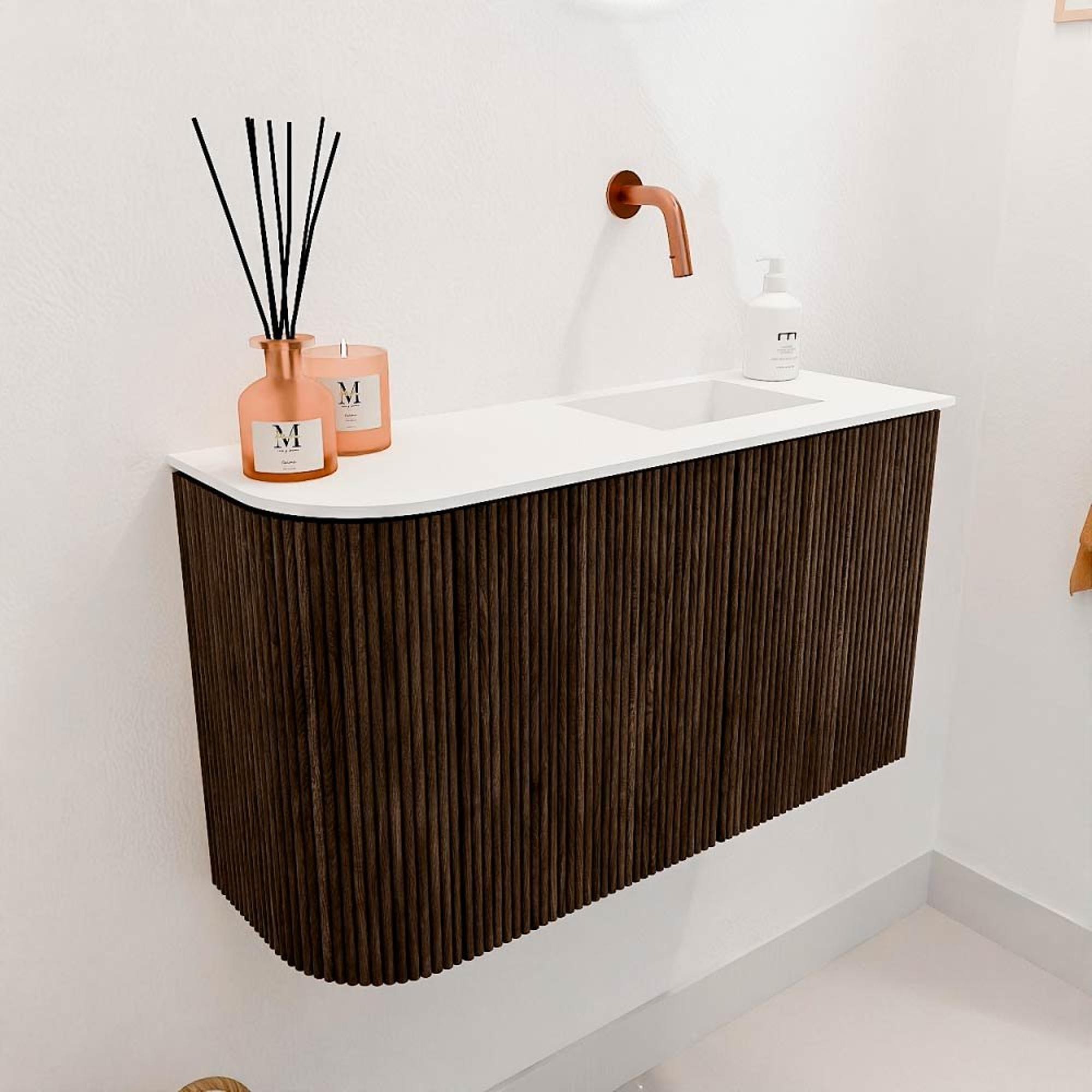 Het meubel valt direct op door de elegante walnootkleur en de verticale ribbelstructuur aan de voorkant. Deze combinatie zorgt voor een tijdloze en toch moderne uitstraling die moeiteloos in verschillende badkamerstijlen past. De subtiele ronding aan de linkerkant geeft het meubel een uniek karakter, waardoor het niet alleen functioneel is, maar ook een echte designuitstraling heeft. De talc-kleurige wastafel met een gladde afwerking sluit perfect aan bij het meubel en zorgt voor een frisse, lichte touch. Zo geniet je van een badkamermeubel dat jouw interieur naar een hoger niveau tilt.