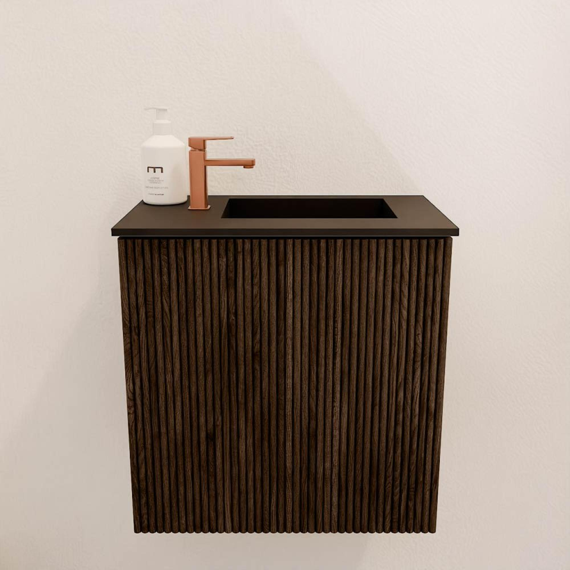 Dit meubel valt direct op door zijn warme walnootafwerking en de verticale ribbels die het front een unieke textuur geven. De combinatie van massief eikenhout aan de voorkant en eikenfineer aan de zijkanten zorgt voor een natuurlijke en luxe uitstraling. Hierdoor krijgt jouw badkamer een tijdloze en toch moderne look die moeiteloos met verschillende interieurstijlen te combineren is. Met dit meubel voeg je een subtiel statement toe aan je badkamer, zonder dat het overheerst. Het is een perfecte keuze als je houdt van een warme, uitnodigende sfeer met een eigentijdse twist.
