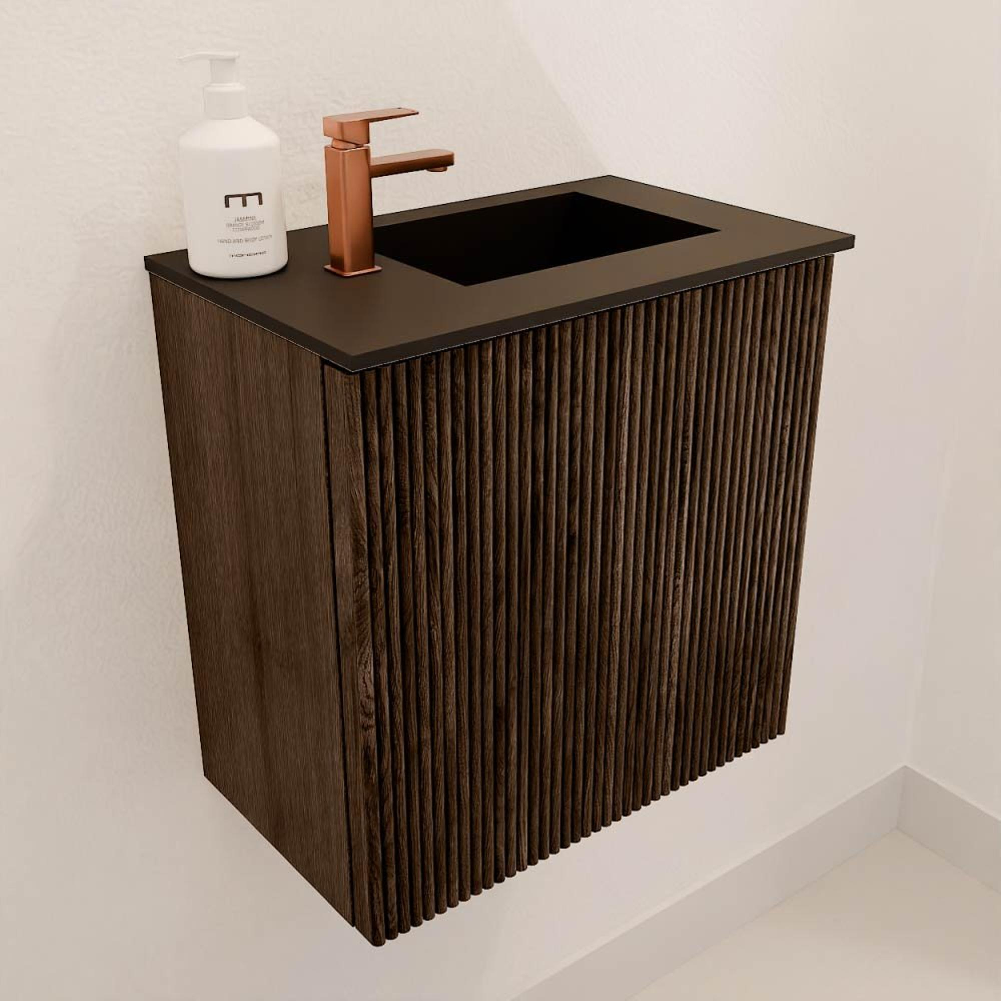 Transformeer jouw badkamer met dit compacte en stijlvolle meubel dat perfect past in kleinere ruimtes zonder in te leveren op elegantie en functionaliteit. Het meubel combineert een warme walnootkleur met een eigentijdse uitstraling dankzij de verticale groeven in het front, wat direct sfeer en karakter toevoegt aan je badkamer. De wastafel met een kraangat aan de rechterkant maakt het gebruiksgemak compleet en sluit naadloos aan op jouw dagelijkse routines. Dankzij het slimme ontwerp en de hoogwaardige materialen geniet je van een meubel dat niet alleen mooi is om te zien, maar ook praktisch in gebruik en eenvoudig te onderhouden. Zo creëer je een badkamer die niet alleen functioneel is, maar ook uitnodigt tot ontspanning en comfort.