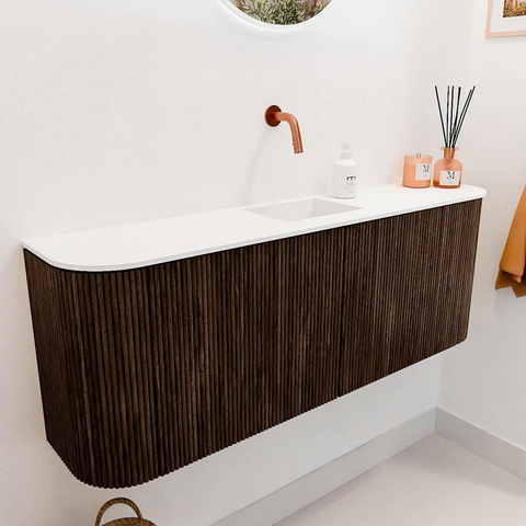 Met zijn warme walnootafwerking en elegante ribbelstructuur op de fronten, brengt dit meubel een natuurlijke en luxe uitstraling in jouw badkamer. De ronde hoeken aan beide zijden zorgen voor een zacht en uitnodigend effect, waardoor het meubel perfect past in zowel moderne als klassieke interieurs. Door het subtiele kleurcontrast tussen het meubel en de talc-wastafel ontstaat een harmonieus geheel dat rust en verfijning uitstraalt. Zo geniet je elke dag van een badkamer die niet alleen functioneel is, maar ook visueel inspireert.