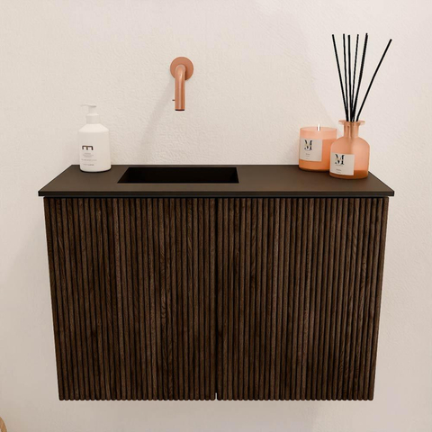 De warme walnootkleur en het ribbelmotief geven dit meubel een luxe uitstraling die je badkamer direct een upgrade geeft. Het strakke, wandhangende ontwerp zorgt voor een ruimtelijk gevoel en maakt schoonmaken een stuk eenvoudiger. Door de subtiele details en hoogwaardige afwerking voelt het meubel niet alleen mooi aan, maar ziet het er ook zo uit. Zo geniet je elke dag van een stijlvolle en uitnodigende badkameromgeving.