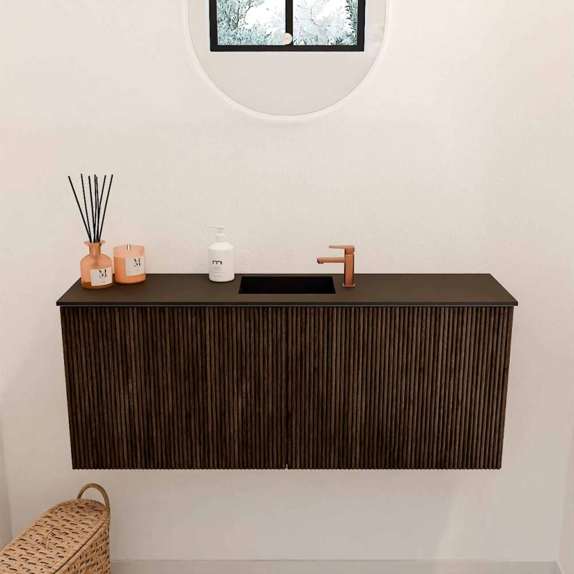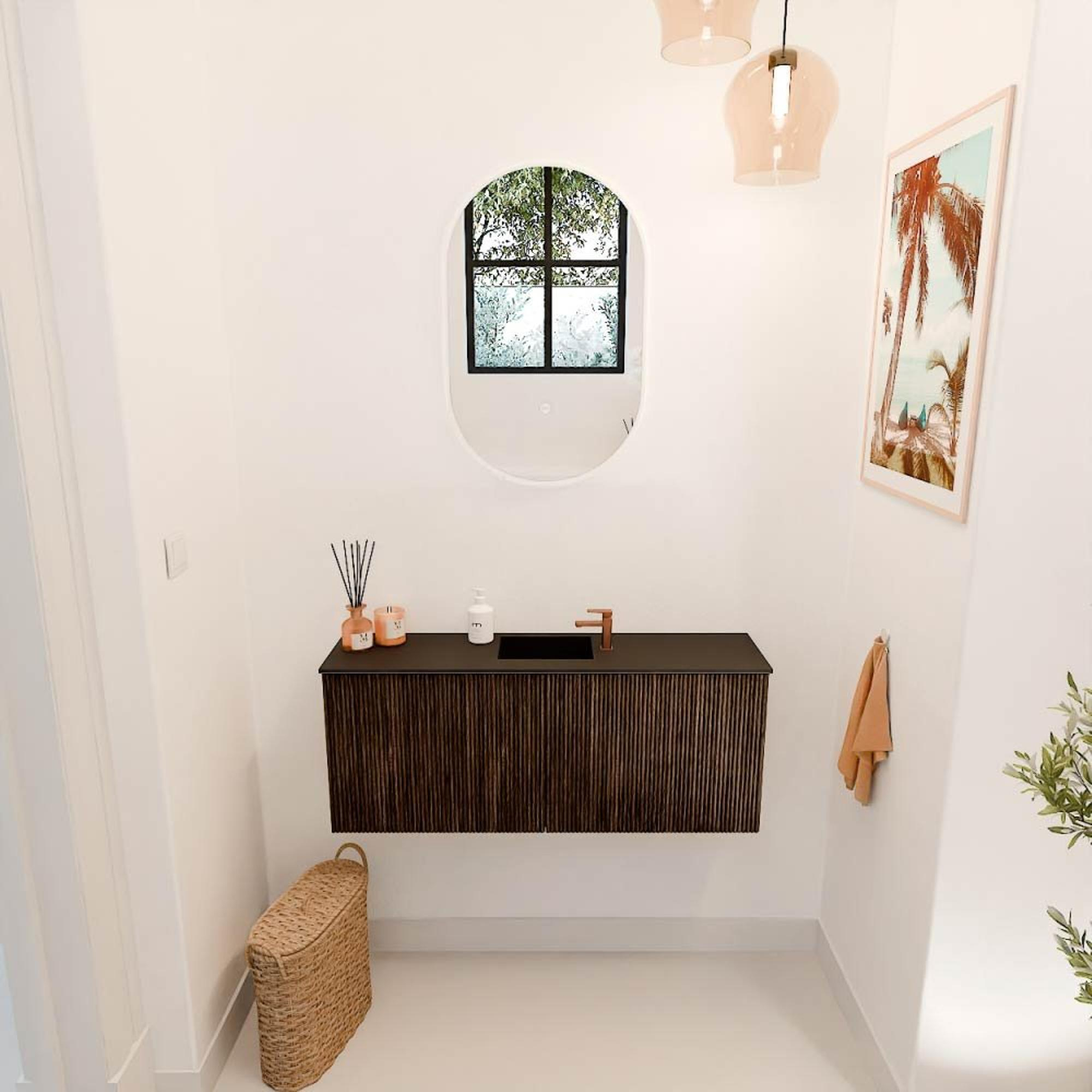 Het meubel valt direct op door zijn elegante uitstraling. De warme walnootkleur in combinatie met de subtiele verticale groeven geeft het een moderne en toch tijdloze look. Dit zorgt ervoor dat het meubel moeiteloos aansluit bij verschillende interieurstijlen, van klassiek tot eigentijds. De wastafel met een strak design en een centraal geplaatst kraangat maakt het geheel compleet. Zo creëer je een badkamer die niet alleen functioneel is, maar ook uitnodigt om te ontspannen en te genieten van het moment.
