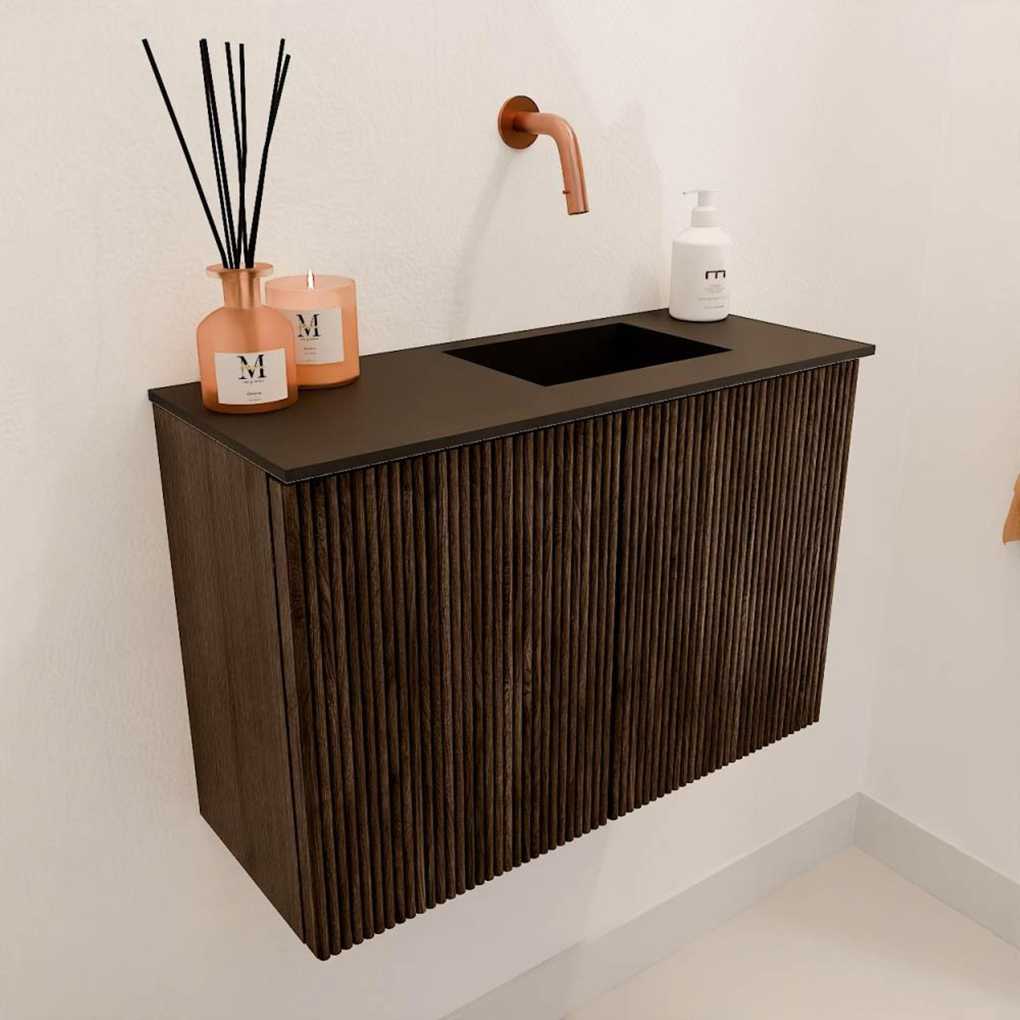 Transformeer jouw toiletruimte met dit prachtige meubel dat niet alleen praktisch is, maar ook een warme en natuurlijke uitstraling geeft aan je badkamer. Het compacte ontwerp van 60 cm breed past perfect in kleinere ruimtes, terwijl de combinatie van massief eikenhout en eikenfineer zorgt voor een hoogwaardige en authentieke sfeer. Dankzij de subtiele verticale ribbelstructuur op de fronten krijgt het meubel een tijdloze en stijlvolle uitstraling die moeiteloos aansluit bij diverse interieurstijlen. De wastafel, met de kraanpositie rechts en zonder kraangat, biedt je de vrijheid om zelf de kraan te kiezen die het beste bij jouw wensen past. Dit meubel is ontworpen om aan de wand te worden gemonteerd, wat zorgt voor een ruimtelijk effect en eenvoudig schoon te houden is. Zo geniet je elke dag van een opgeruimde en sfeervolle toiletruimte die uitnodigt tot ontspanning en comfort.