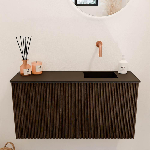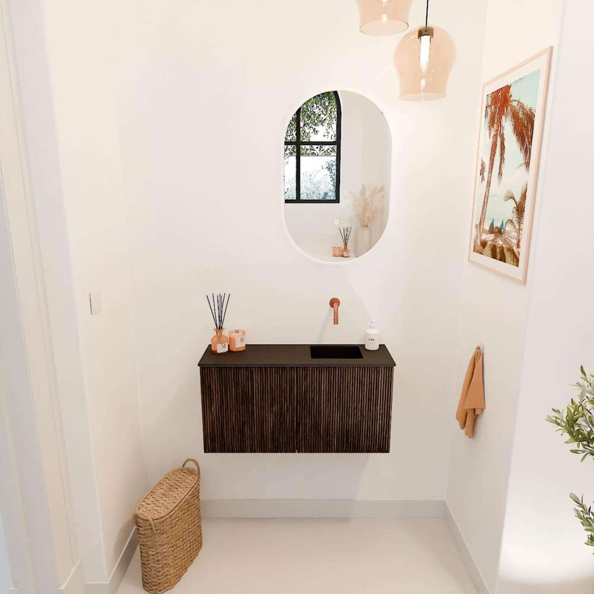 Het meubel valt direct op door het unieke design met verticale ribbels, die een chique en moderne uitstraling geven. De warme walnootkleur zorgt voor een natuurlijke en uitnodigende sfeer, terwijl de strakke lijnen en het matzwarte wastafelblad een eigentijdse touch toevoegen. Dit samenspel van materialen en kleuren maakt het meubel een echte blikvanger in je badkamer. Door de doordachte vormgeving past het moeiteloos in zowel klassieke als moderne interieurs. Zo creëer je een badkamer die niet alleen functioneel is, maar ook een plek waar je trots op bent.
