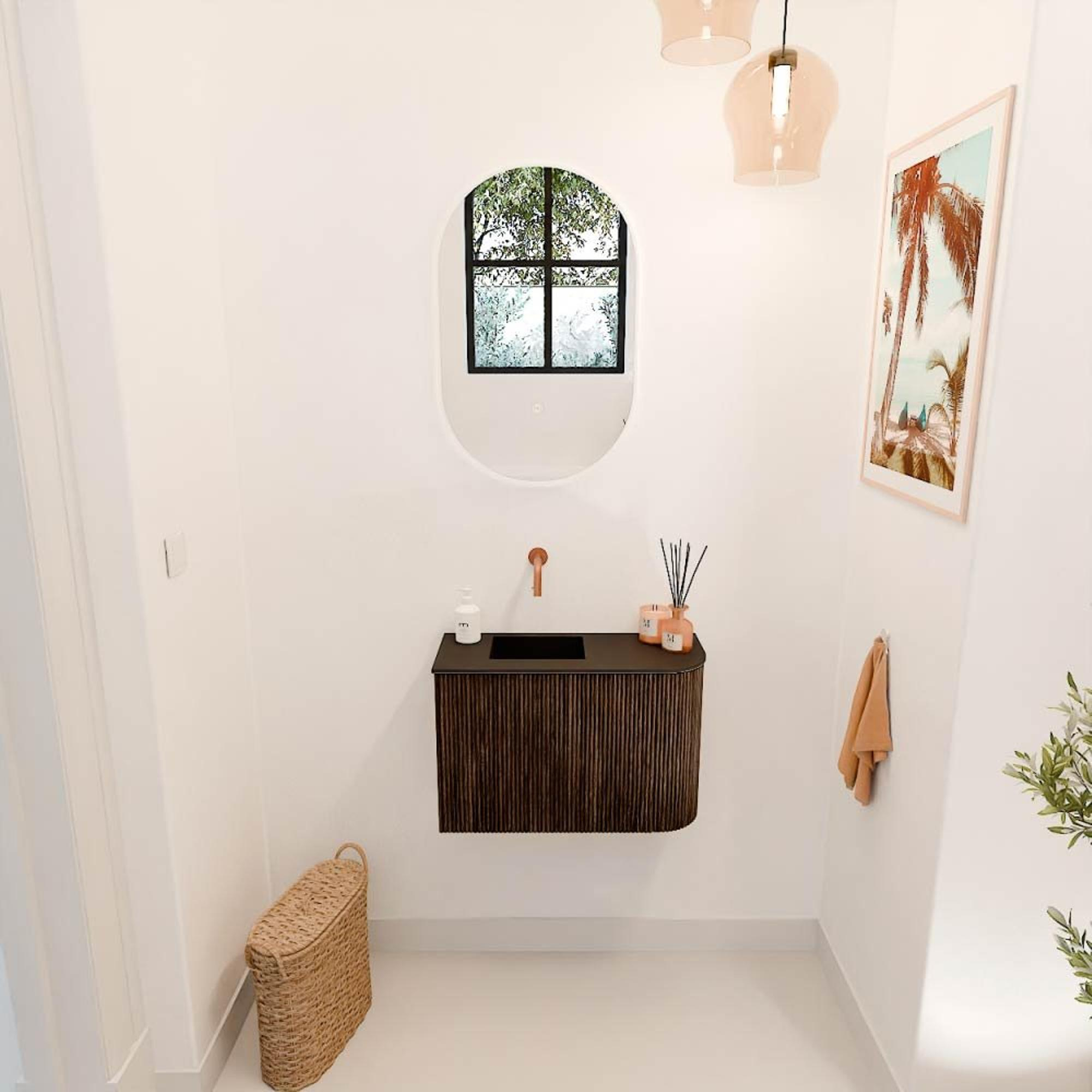 Met dit prachtige meubel geef je jouw badkamer of gastentoilet direct een warme, natuurlijke uitstraling. Het combineert een compact formaat met een doordacht design, waardoor het perfect past in kleinere ruimtes zonder in te leveren op stijl of functionaliteit. De subtiele ronding aan de rechterkant zorgt voor een speels accent, terwijl de warme walnootkleur een gevoel van luxe en comfort toevoegt. De wastafel, geplaatst aan de linkerkant, is gemaakt van duurzaam Solid Surface materiaal dat niet alleen mooi oogt, maar ook makkelijk schoon te houden is. Dankzij het ontbreken van een kraangat kun je zelf bepalen welke kraan het beste bij jouw wensen past. Zo creëer je een badkamermeubel dat naadloos aansluit op jouw persoonlijke stijl en praktische behoeften. Dit meubel tilt jouw badkamer naar een hoger niveau en maakt het dagelijks gebruik een stuk aangenamer.