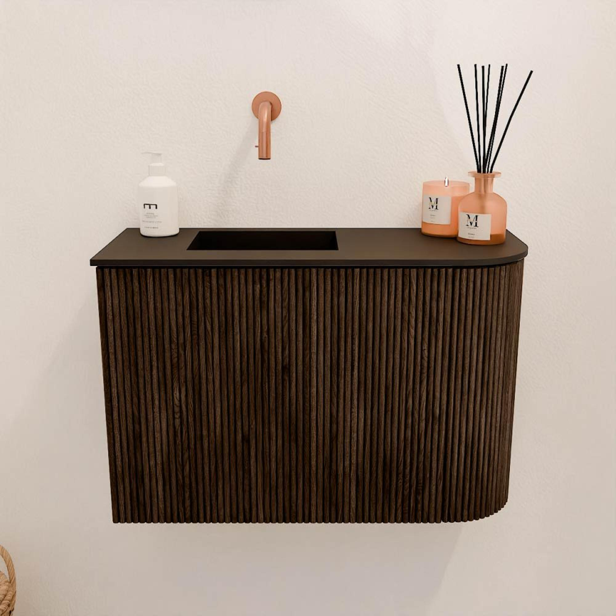 De verticale ribbelstructuur op het front geeft het meubel een moderne en luxueuze uitstraling die direct opvalt. De warme walnootkleur versterkt dit effect en zorgt voor een natuurlijke sfeer in je badkamer. Dit meubel is niet zomaar functioneel, het is een echte blikvanger die jouw ruimte karakter geeft. Door het gebruik van massief eikenhout aan de voorkant en fineer aan de zijkanten geniet je van een authentieke houtlook die met de tijd alleen maar mooier wordt. Zo voeg je een tijdloos element toe dat moeiteloos combineert met diverse interieurstijlen, van modern tot klassiek.