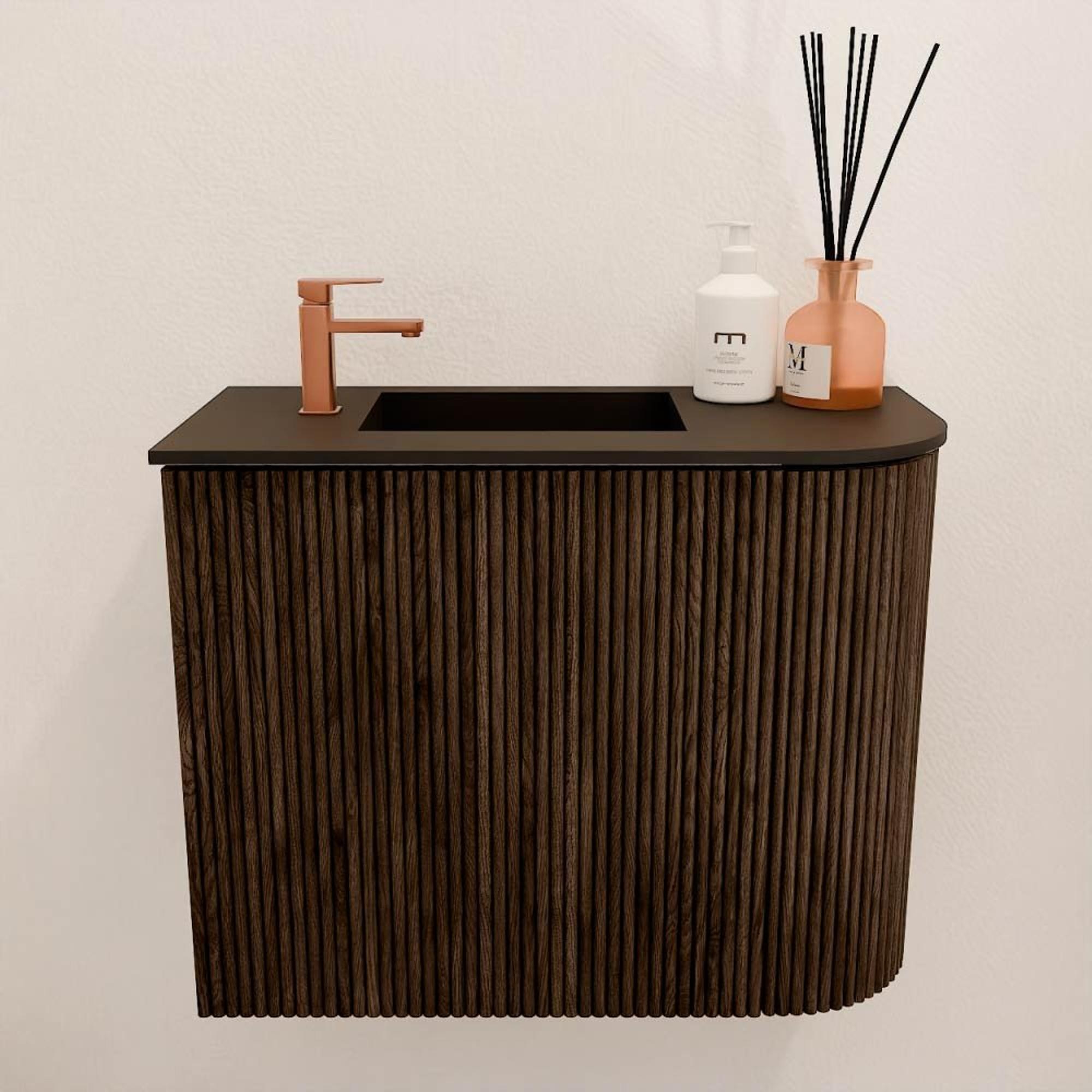 Het meubel valt direct op door zijn elegante, verticale ribbelstructuur aan de voorzijde, die zorgt voor een eigentijdse en verfijnde uitstraling. De warme walnootkleur accentueert de natuurlijke houtnerf en brengt een gevoel van luxe en comfort in jouw badkamer. Door de subtiele ronding aan de rechterkant krijgt het meubel een uniek karakter dat je nergens anders vindt. Dit maakt het niet alleen een functioneel element, maar ook een stijlvol pronkstuk dat jouw toiletruimte een persoonlijke touch geeft.
