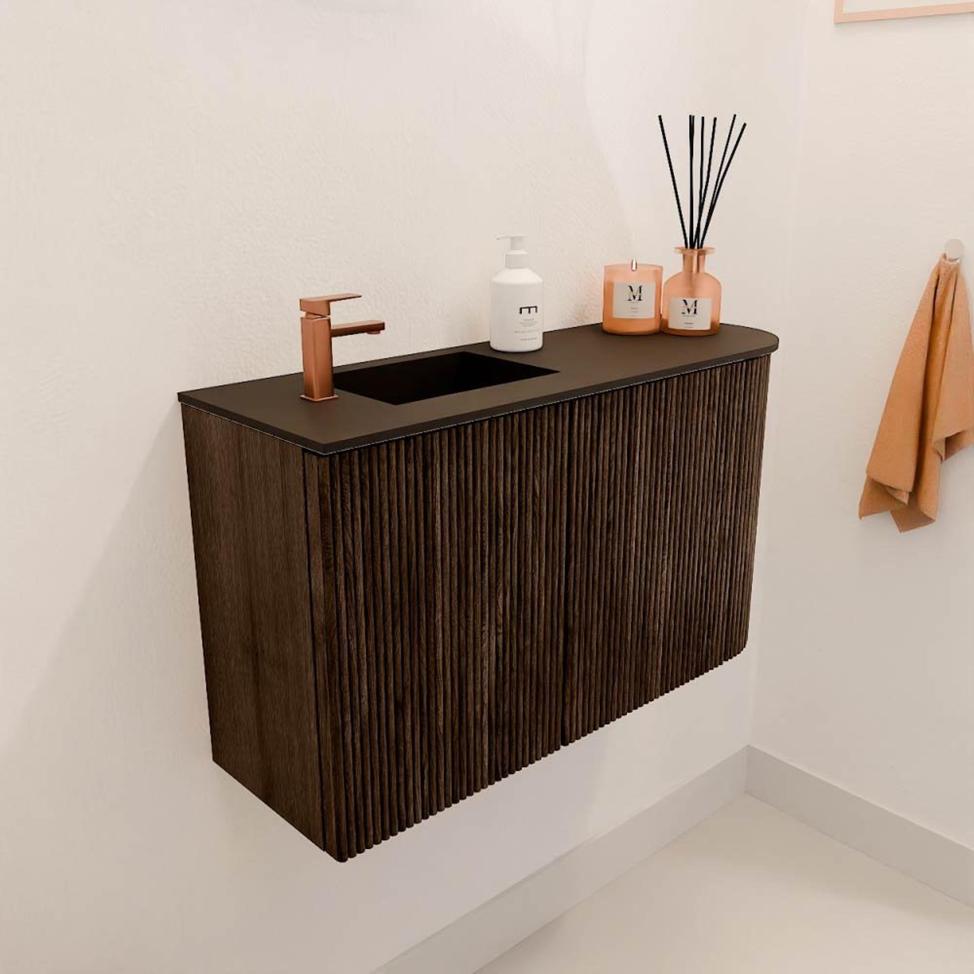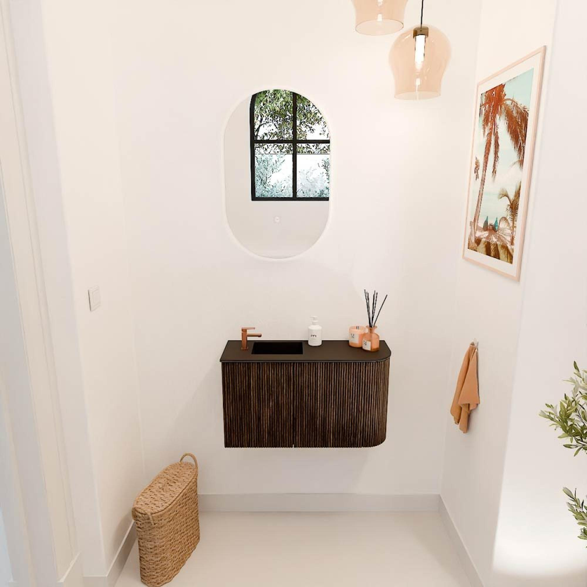 De warme walnootkleur en het elegante ribbelpatroon geven dit meubel een unieke uitstraling die direct opvalt. Het design met de rechter ronding zorgt voor een speels en toch strak effect, waardoor het meubel een echte blikvanger is in jouw badkamer. Door de combinatie van natuurlijke houttinten en moderne vormen creëer je een sfeer die zowel rustgevend als verfijnd is. Dit maakt het meubel perfect voor wie houdt van een stijlvolle badkamer met karakter.