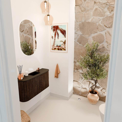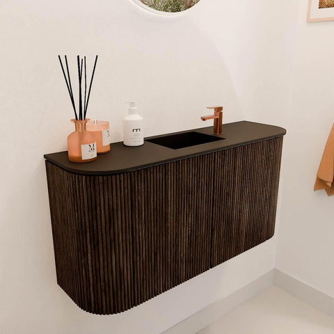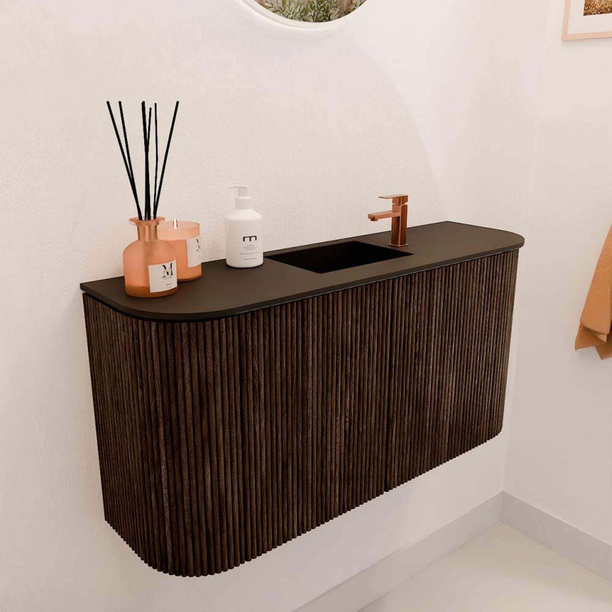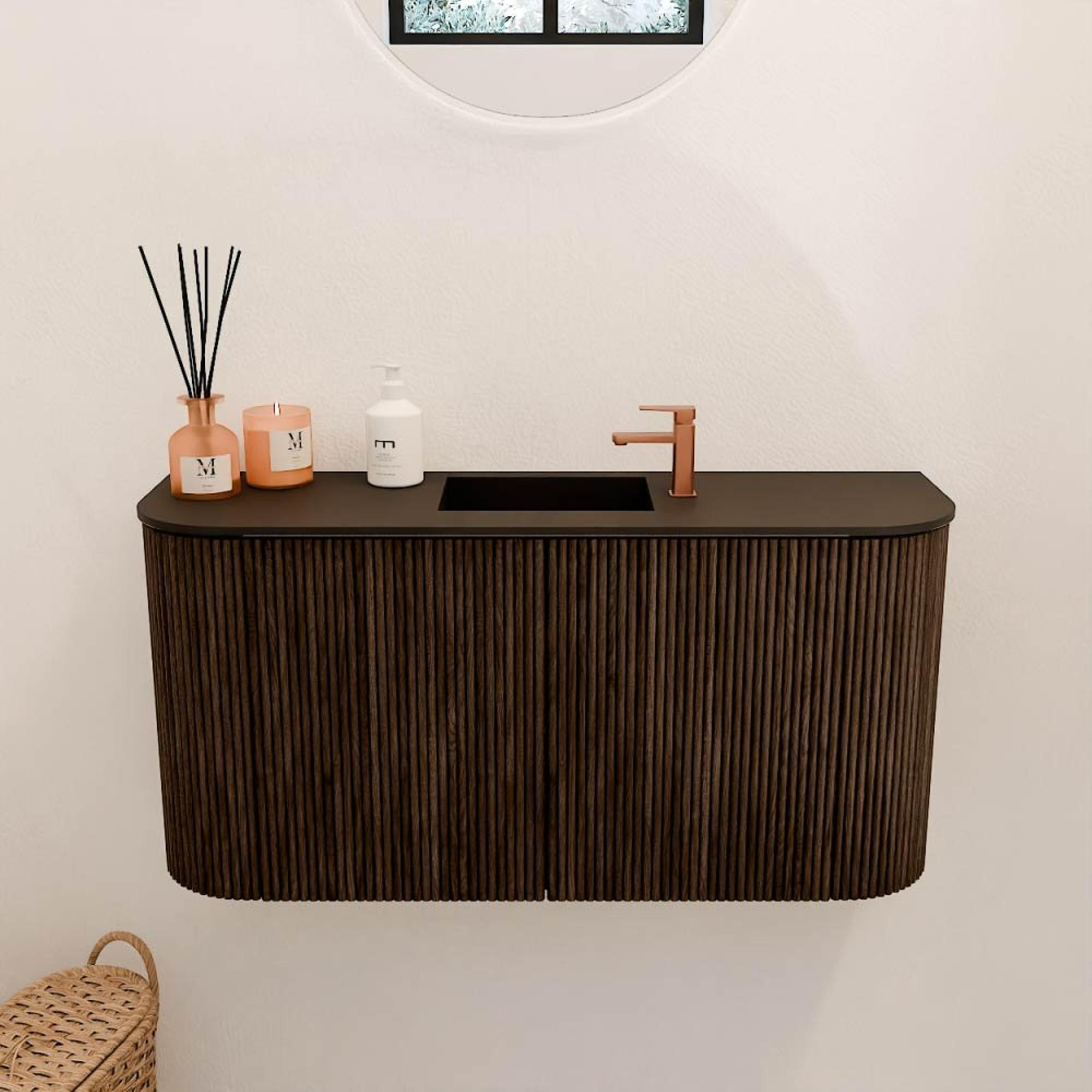 Het meubel valt direct op door zijn elegante ribbelstructuur op de fronten en de warme walnootkleur. Deze combinatie zorgt voor een tijdloze uitstraling die moeiteloos aansluit bij zowel klassieke als moderne badkamers. De subtiele rondingen aan de linker- en rechterkant geven het geheel een unieke, zachte touch die je nergens anders vindt. Zo voeg je niet alleen een functioneel element toe, maar ook een stijlvol pronkstuk dat jouw badkamer een exclusieve sfeer geeft.