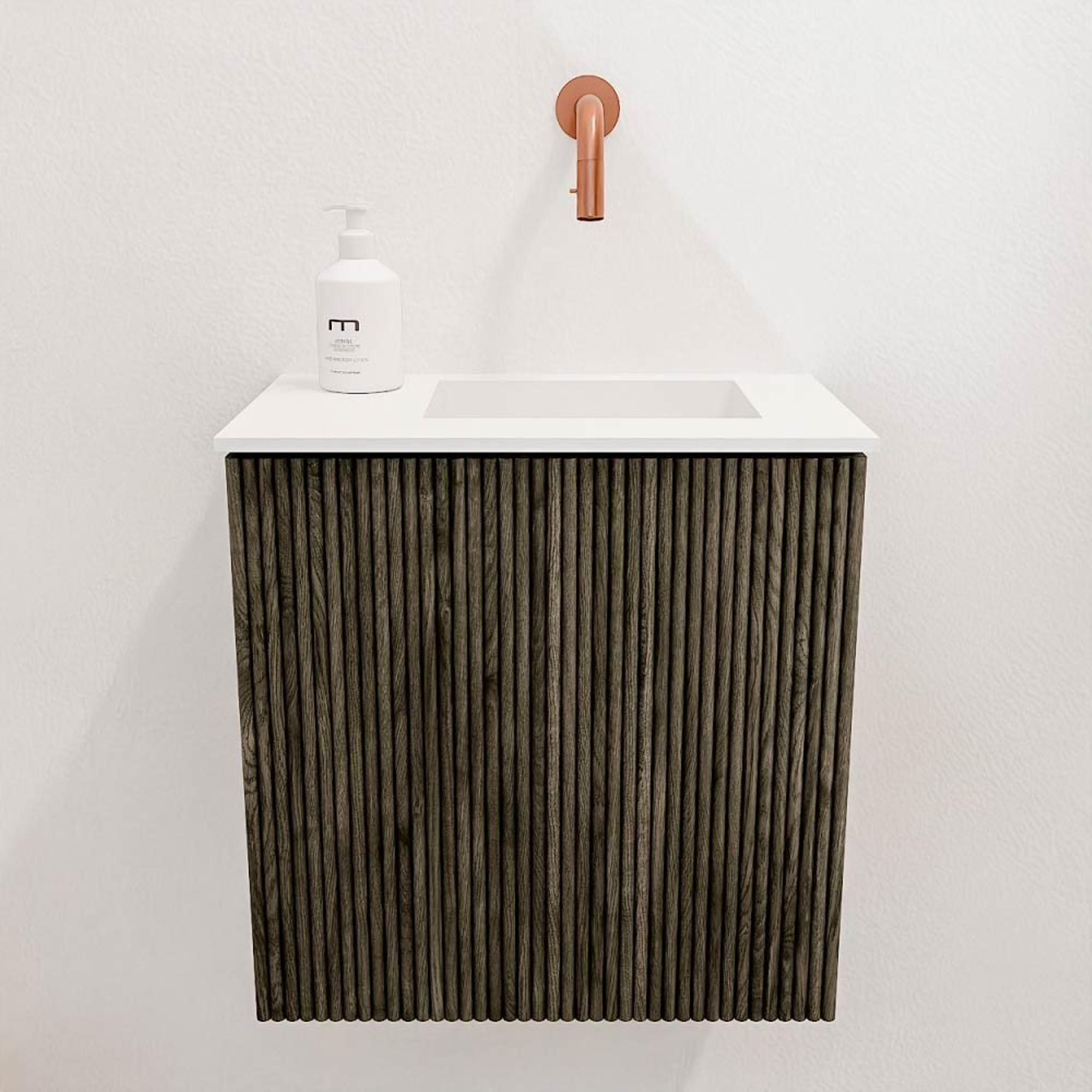 Transformeer jouw badkamer met dit compacte en stijlvolle meubel dat perfect past in kleinere ruimtes zonder in te leveren op design of functionaliteit. Het meubel combineert een eigentijdse uitstraling met praktische voordelen, waardoor je badkamer direct een luxe en verzorgde sfeer krijgt. Dankzij de subtiele kleur Shadow en het strakke design met verticale ribbels, krijgt jouw ruimte een moderne en verfijnde uitstraling. De wastafel, gemaakt van hoogwaardig Solid Surface materiaal, voelt niet alleen zijdezacht aan maar is ook duurzaam en gemakkelijk schoon te houden. Met de wastafel aan de rechterkant creëer je een slimme indeling die optimaal gebruikmaakt van de beschikbare ruimte. Dit meubel is ideaal voor wie houdt van een rustige, stijlvolle badkamer met een tijdloze uitstraling en oog voor detail.