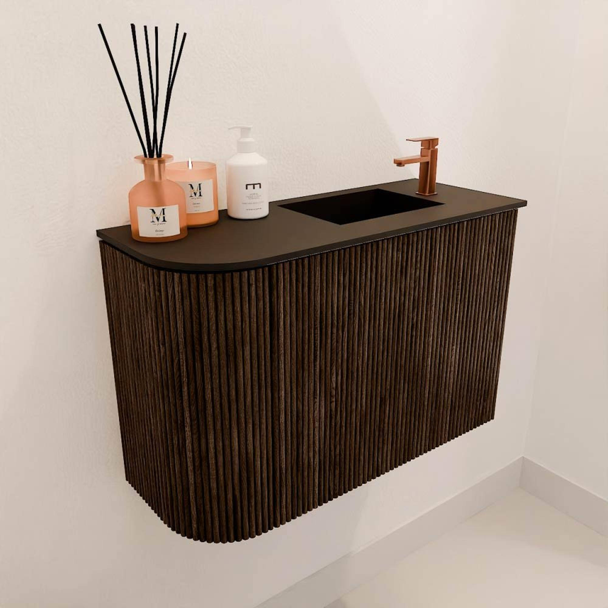 Dit meubel valt direct op door zijn warme walnootkleur en het elegante ribbelfront dat een subtiele textuur toevoegt zonder te overheersen. De afgeronde linkerkant geeft het geheel een unieke uitstraling die jouw badkamer net dat beetje extra charme geeft. Door de combinatie van massief eikenhout en eikenfineer straalt het meubel niet alleen kwaliteit uit, maar past het ook moeiteloos in zowel moderne als klassieke interieurs. Zo creëer je een badkamer die niet alleen functioneel is, maar ook een lust voor het oog.